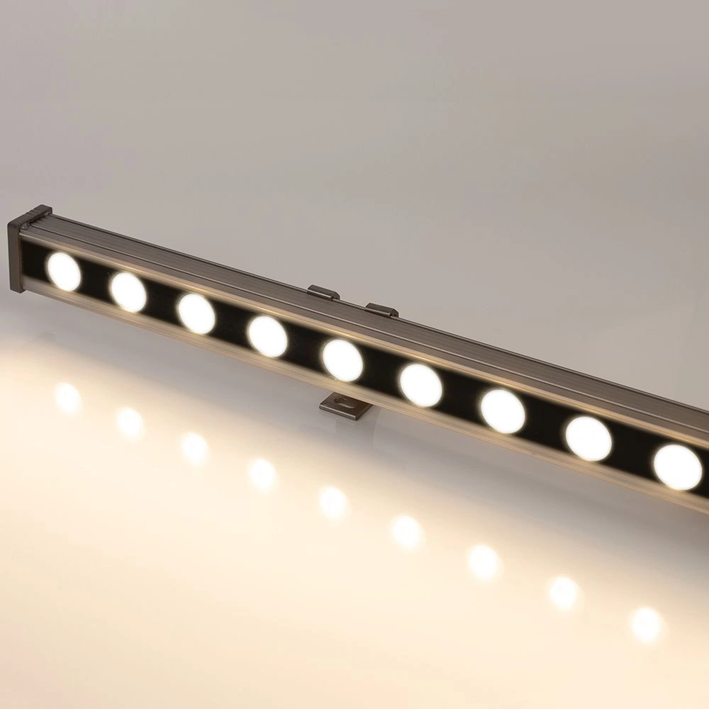 Ультратонкий линейный прожектор AR-LINE-1000M-24W-220V White (Grey, 30 deg) мощностью 24 Вт с белой температурой свечения 6000К и световым потоком 1920лм широко используется для декоративной подсветки зданий, а также архитектурных и скульптурных объектов: памятников, мостов, арок и т. д. Специальная оптика, установленная в прожекторе, формирует распределение светового потока с узконаправленным углом излучения 30°, что позволяет создать яркую и красивую иллюминацию фасадов зданий, а также сделать акценты на архитектурных формах. Применение в прожекторе SMD-светодиодов с высокой световой эффективностью 80 лм/Вт экономит значительную долю электроэнергии. Алюминиевый корпус серого цвета, с размерами 1000х40х30 мм и степенью пылевлагозащиты на уровне IP65, дает возможность эксплуатировать прожектор как в помещениях, так и на открытом воздухе, избегая места с большим скоплением воды. Встроенный драйвер позволяет быстро и безопасно подключить прожектор напрямую к сети 230 В. Герметичные разъемы, входящие в комплект, упрощают подключение прожектора к кабелю питания и соединение прожекторов последовательно в группы, а два поворотных кронштейна обеспечивают надежный монтаж на поверхности.