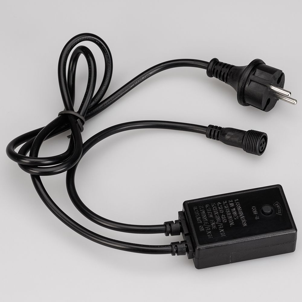 Контроллер предназначен для управления светодиодными гирляндами с эффектом динамики. В комплект входит шнур питания с вилкой европейского стандарта (IP44), 3pin разъем для подключения к гирлянде, выпрямитель AC/DC (1.6А), а также контроллер для смены режимов динамического свечения. Контроллер имеет 8 режимов, которые переключаются по кнопке на корпусе. Оболочка из черного ПВХ придает ему элегантный внешний вид. Длина провода составляет 1,5 метра, что позволяет удобно располагать гирлянду.