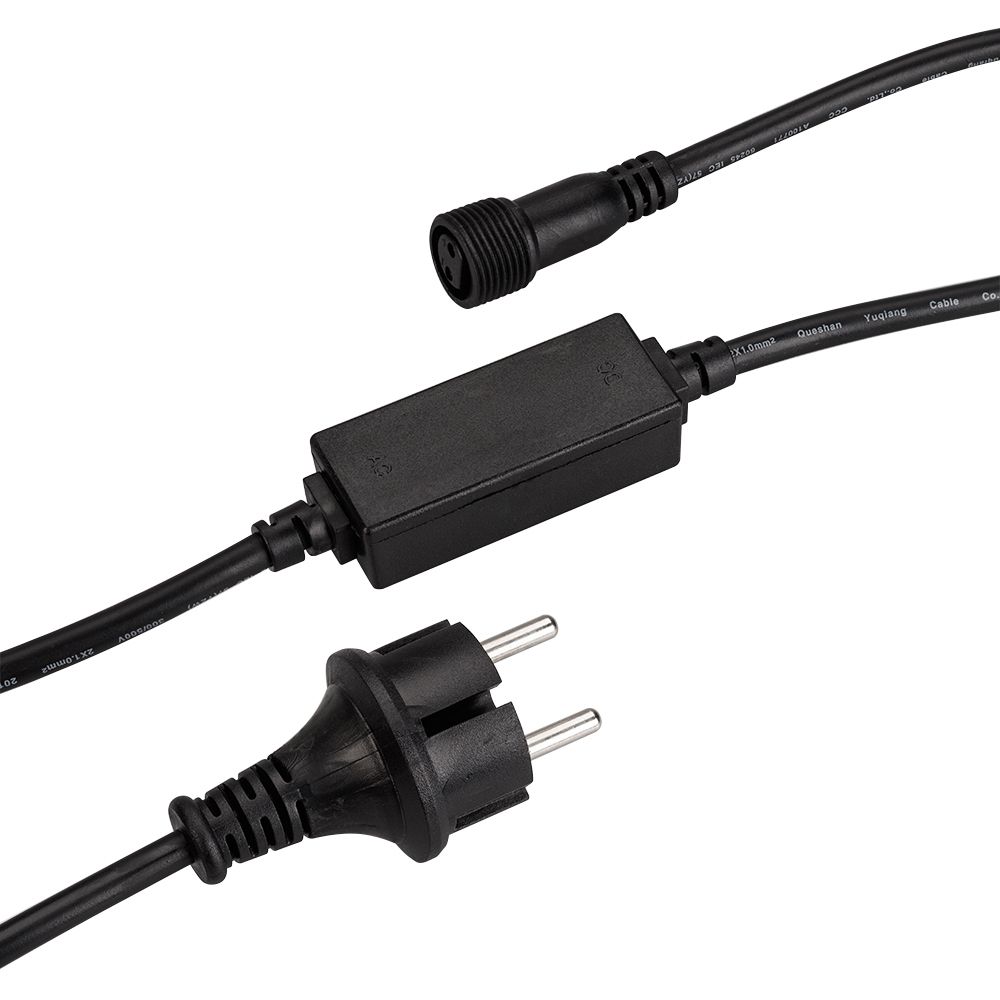 Шнур питания специально разработан для подключения светодиодных гирлянд с эффектом постоянного свечения к сети. В комплект входит шнур питания с вилкой европейского стандарта (IP44), 2pin разъем для подключения к гирлянде, а также выпрямитель AC/DC (1.6А). Оболочка из черного ПВХ придает ему элегантный внешний вид. Длина провода составляет 1,5 метра, что позволяет удобно располагать гирлянду.