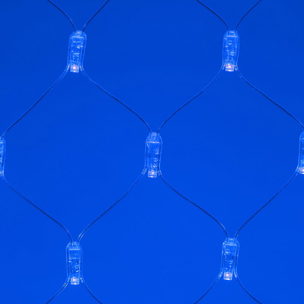 Светодиодная сеть Classic. 2000x1500 (длина 2000 мм, высота 1500 мм). Цвет свечения СИНИЙ. 288 светодиодов размером 7 мм со статическим и 8 динамическими эффектами свечения с резким световым рисунком (прозрачная вогнутая линза). Провод прозрачный, ПВХ. Питание 230 В, Мощность 18 Вт,защита IP65, применение в помещении и на улице под навесом Аксессуары для подключения и выбора режима свечения в комплекте.