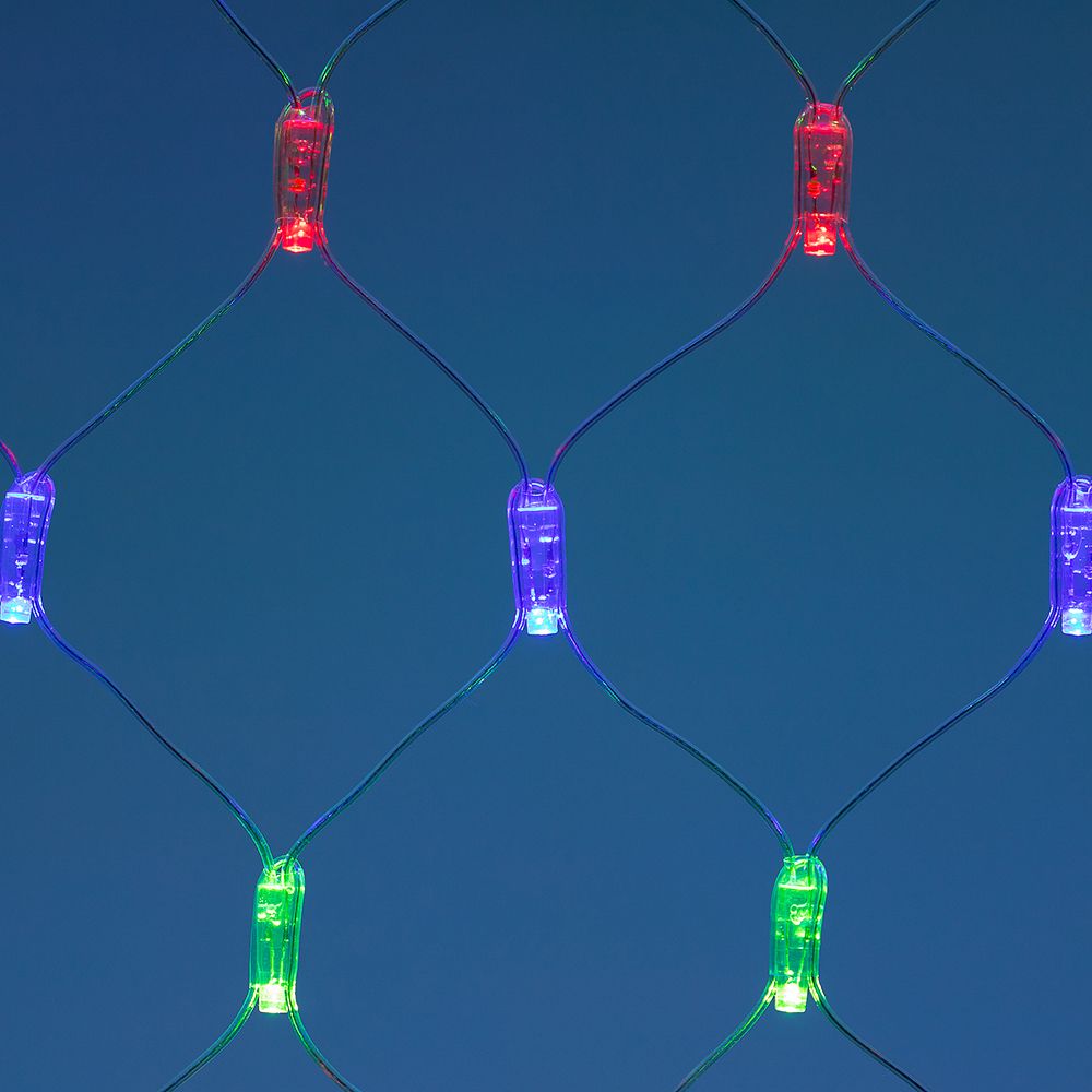 Светодиодная сеть Classic. 2000x1500 (длина 2000 мм, высота 1500 мм). Цвет свечения RGBY (светодиоды чередуются). 288 светодиодов размером 7 мм со статическим и 8 динамическими эффектами свечения с резким световым рисунком (прозрачная вогнутая линза). Провод прозрачный, ПВХ. Питание 230 В, Мощность 18 Вт,защита IP65, применение в помещении и на улице под навесом Аксессуары для подключения и выбора режима свечения в комплекте.