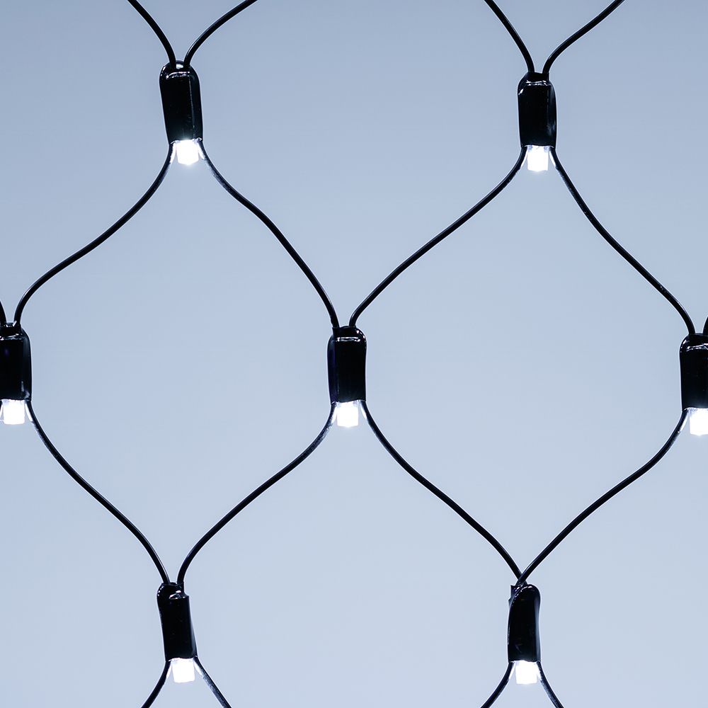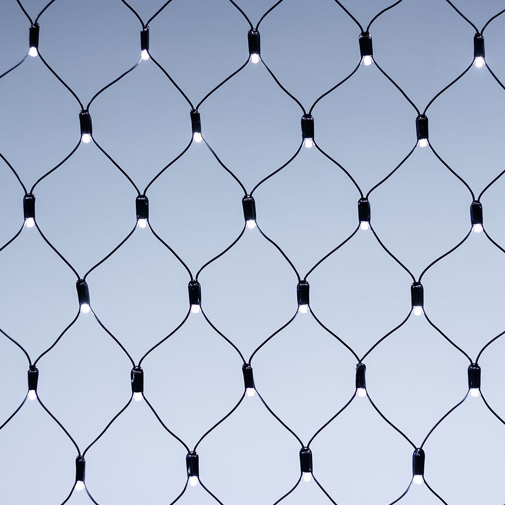 Светодиодная сеть Classic. 2500x2500 (длина 2500 мм, высота 2500 мм). Цвет свечения БЕЛЫЙ (6000 К). 432 светодиода размером 7 мм со статическим и 8 динамическими эффектами свечения с резким световым рисунком (прозрачная вогнутая линза). Провод черный, ПВХ. Питание 230 В, Мощность 26 Вт,защита IP65, применение в помещении и на улице под навесом Аксессуары для подключения и выбора режима свечения в комплекте.