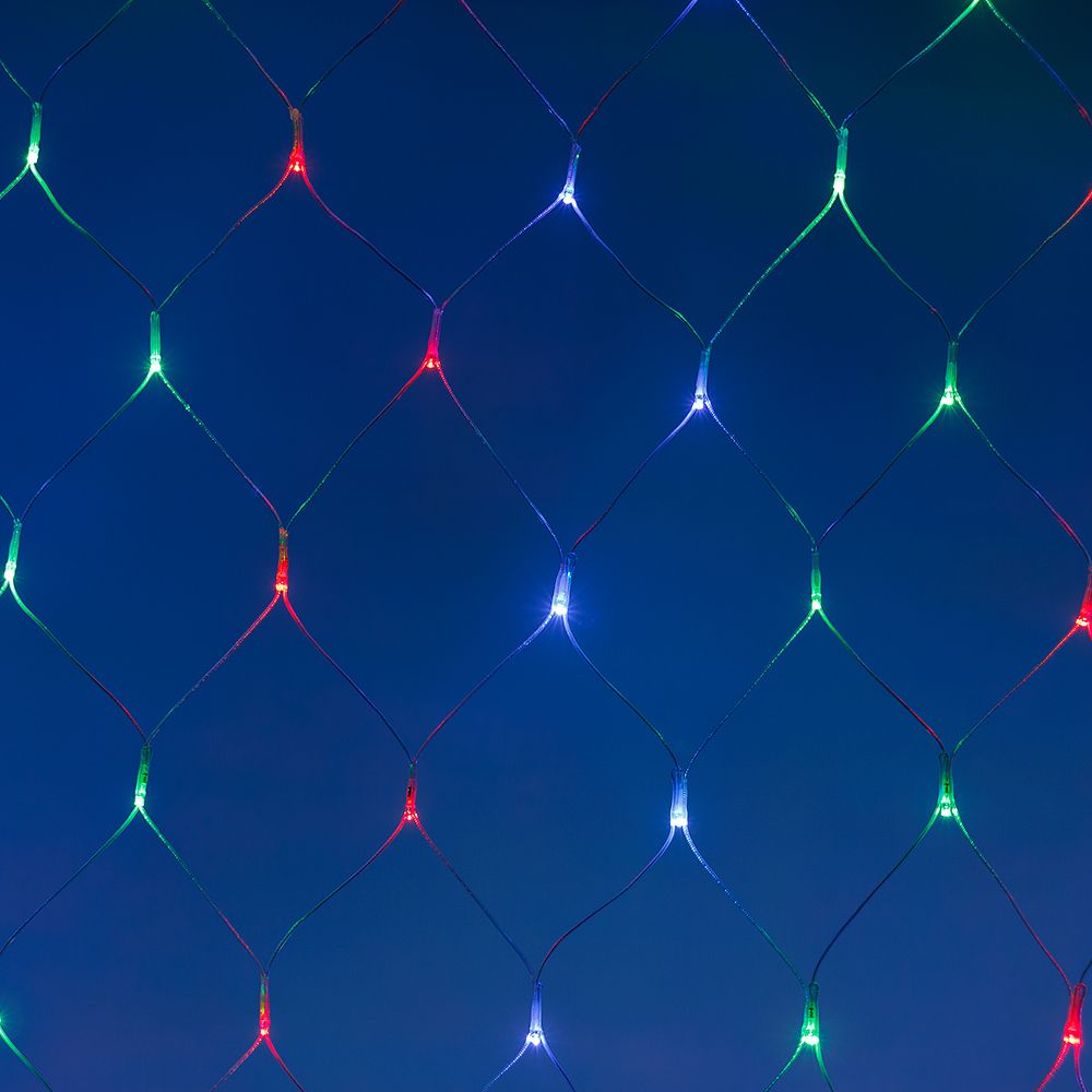 Светодиодная сеть Home. 1800x1500 (длина 1800 мм, высота 1500 мм). Цвет свечения RGBY (светодиоды чередуются). 180 светодиодов размером 5 мм со статическим и 8 динамическими эффектами свечения с резким световым рисунком (прозрачная вогнутая линза). Провод прозрачный, ПВХ. Питание 230 В, Мощность 15 Вт, защита IP20, применение в помещении. Аксессуары для подключения и выбора режима свечения в комплекте.