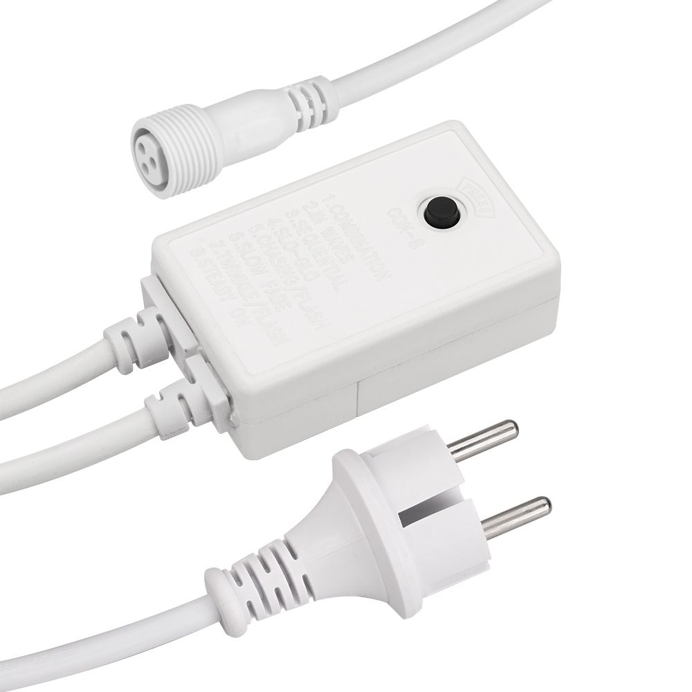 Контроллер предназначен для управления светодиодными гирляндами с эффектом динамики. В комплект входит шнур питания с вилкой европейского стандарта (IP44), 3pin разъем для подключения к гирлянде, выпрямитель AC/DC (1.6А), а также контроллер для смены режимов динамического свечения. Контроллер имеет 8 режимов, которые переключаются по кнопке на корпусе. Оболочка из белого каучука придает ему элегантный внешний вид. Длина провода составляет 1,5 метра, что позволяет удобно располагать гирлянду.