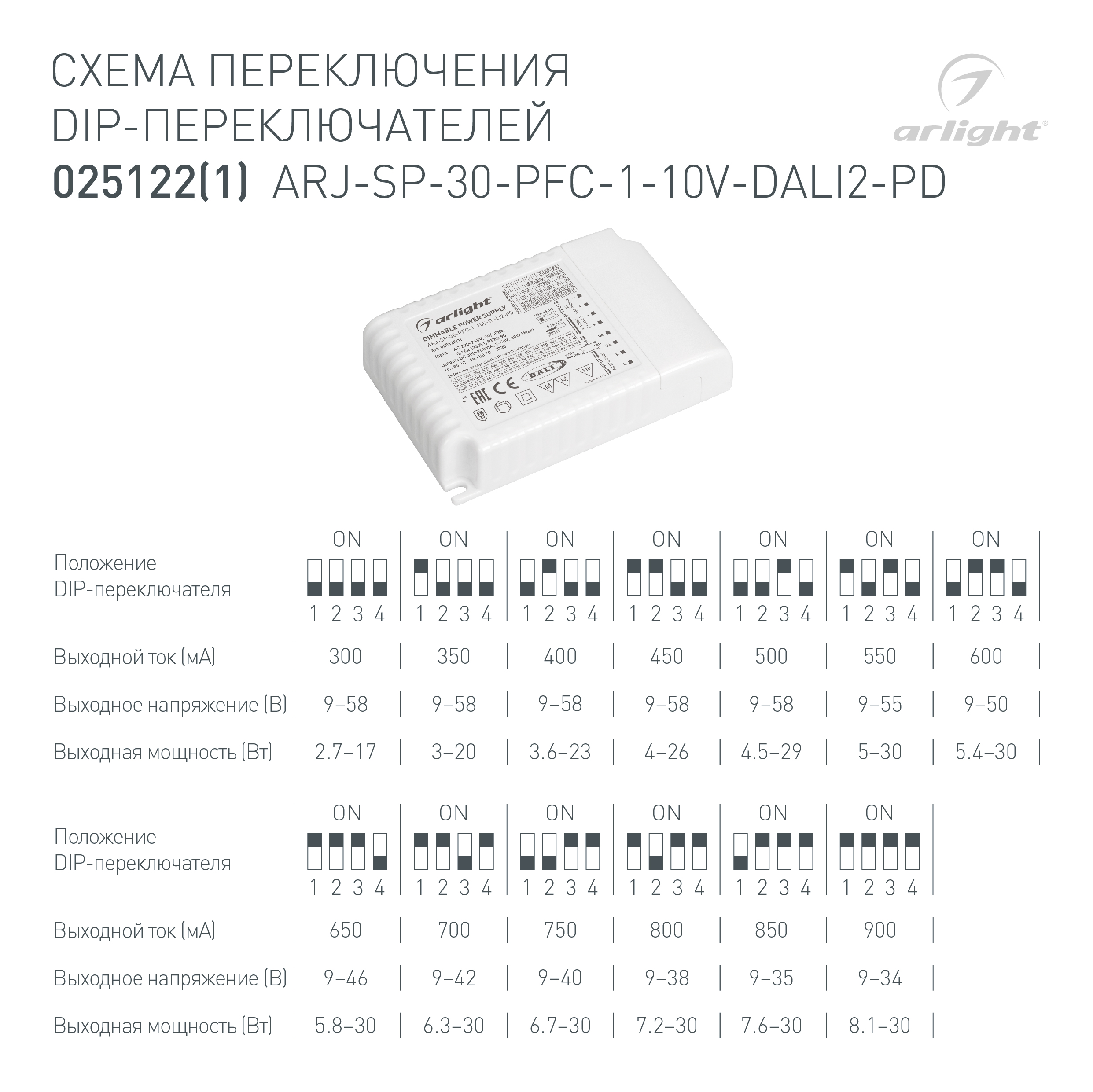 Характеристики - Блок питания ARJ-SP-30-PFC-1-10V-DALI2-PD (30W, 300-900mA) (Arlight, IP20 Пластик, 5 лет)