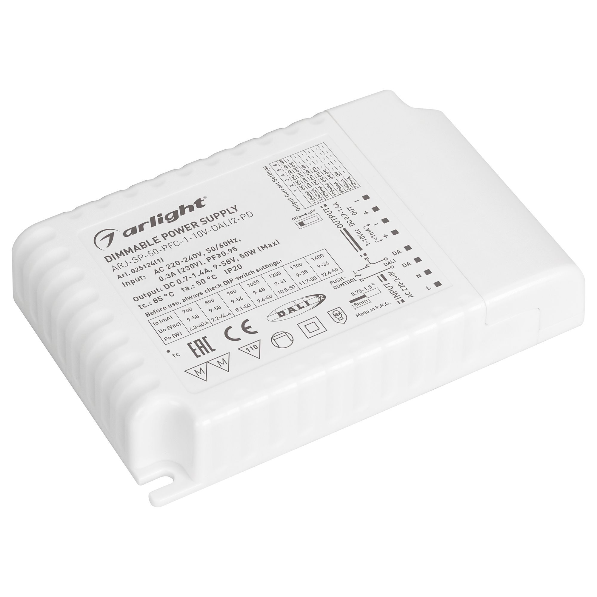 Характеристики - Блок питания ARJ-SP-50-PFC-1-10V-DALI2-PD (50W, 700-1400mA) (Arlight, IP20 Пластик, 5 лет)