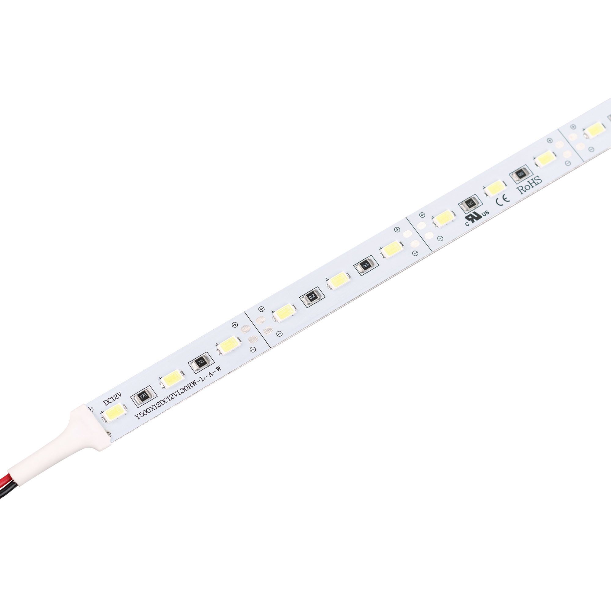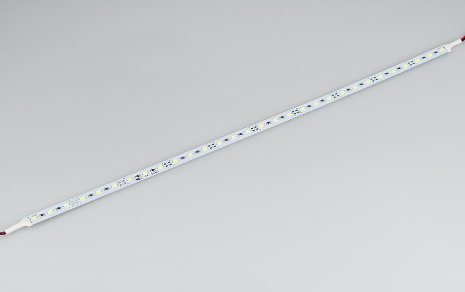 Светодиодная линейка шириной 12 мм. Светодиоды SMD 5730 холодного белого цвета свечения (9000 К) с индексом цветопередачи CRI>75. Толщина алюминиевой платы 1 мм. Мощность 6 Вт, напряжение питания 12 В. Длина проводов для подключения с двух сторон 8 см. Минимальный отрезок 50 мм.