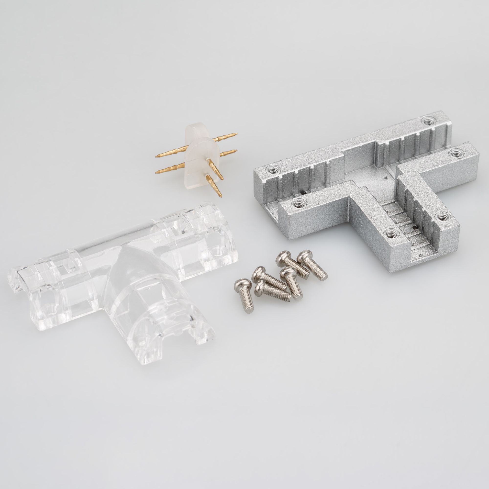 Тройной двухконтактный соединитель подходит для герметичной ленты сечения 16x18 мм из серии NEON. Он обеспечивает непрерывное соединение и создает сплошную линию свечения без разрывов. Для достижения уровня защиты IP65, требуется дополнительная герметизация при соединении. Соединитель изготовлен из алюминия и прозрачного пластика, что придает ему прочность и эстетичный вид. Размеры соединителя составляют 60х45х20.7 мм.