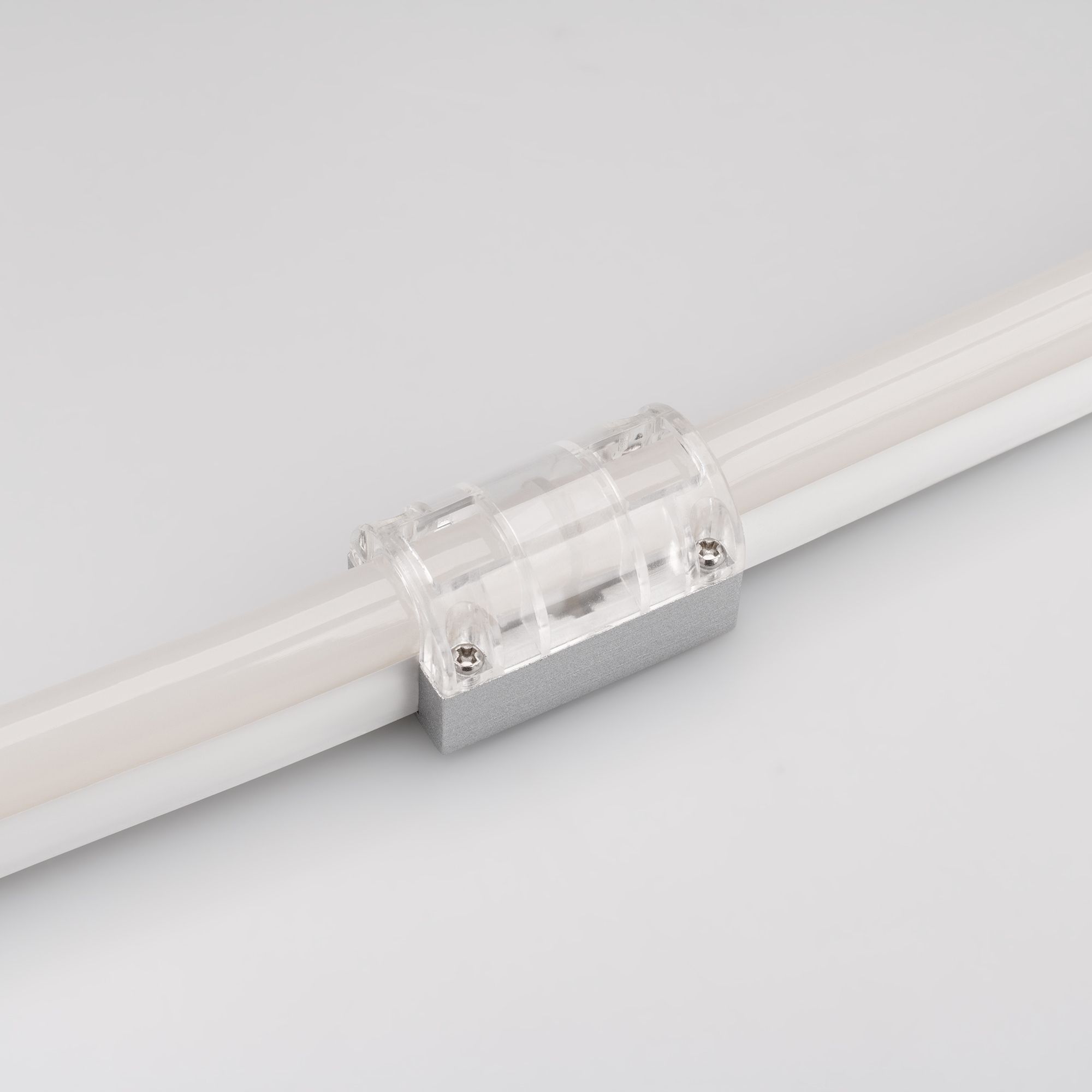 Прямой двухконтактный соединитель подходит для герметичной ленты сечения 26x15 мм из серии NEON. Он обеспечивает непрерывное соединение и создает сплошную линию свечения без разрывов. Для достижения уровня защиты IP65, требуется дополнительная герметизация при соединении. Соединитель изготовлен из алюминия и прозрачного пластика, что придает ему прочность и эстетичный вид. Размеры соединителя составляют 50х30х29.7 мм.