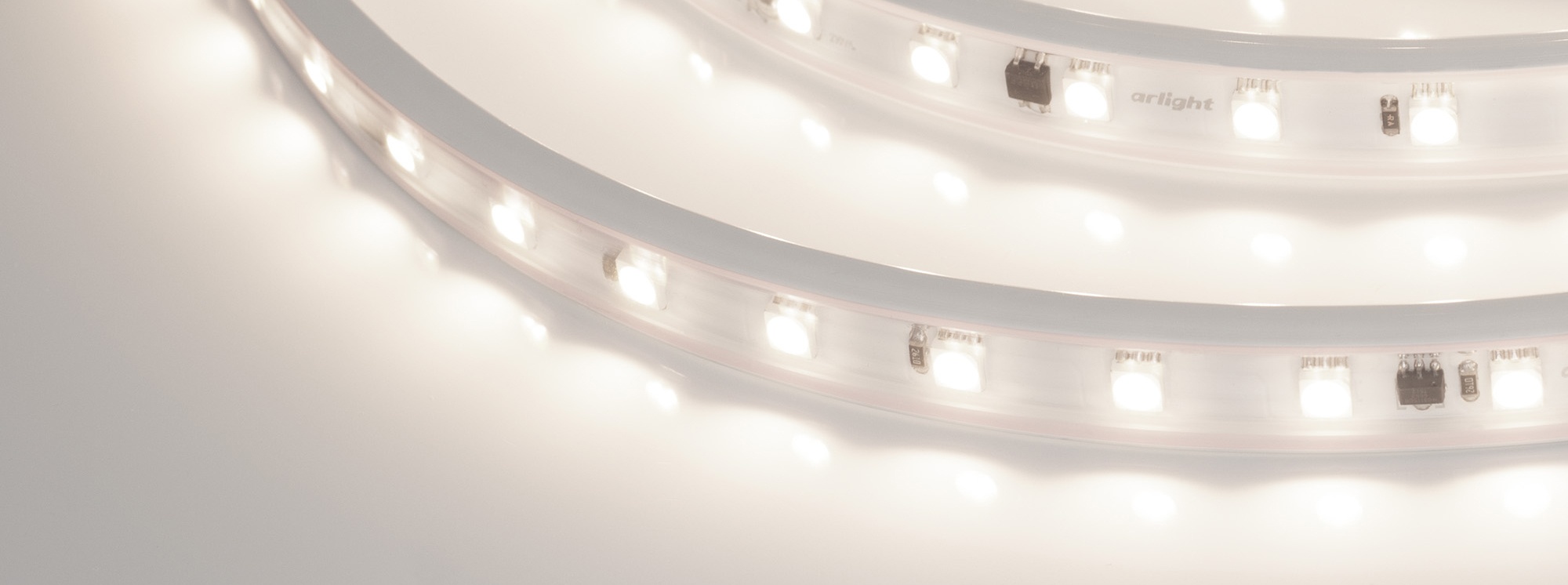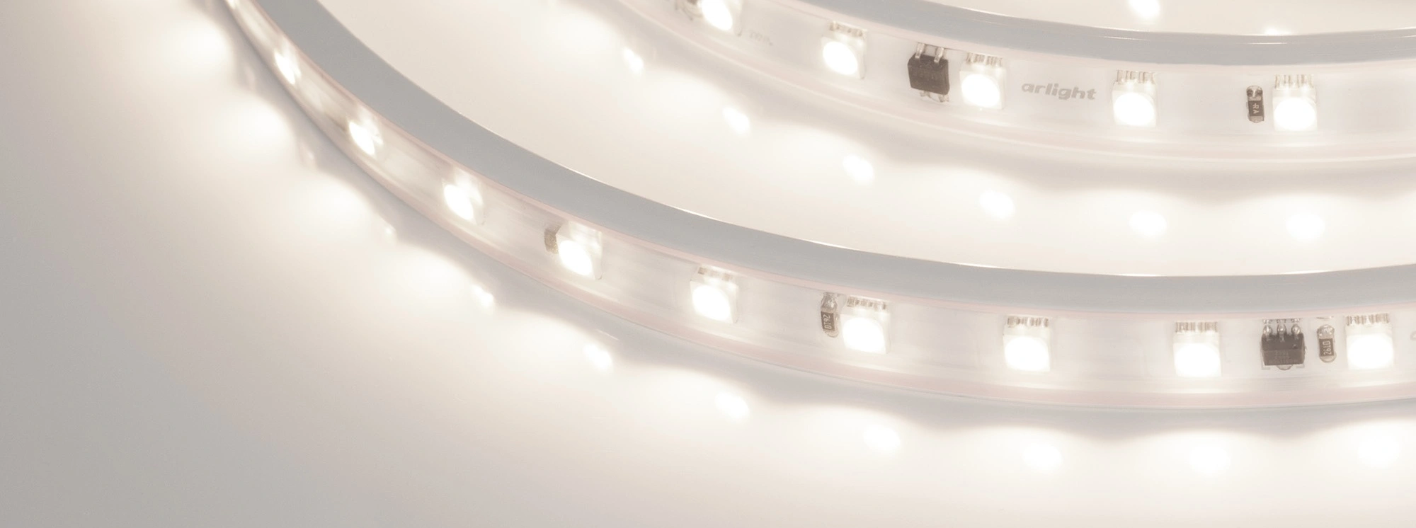 Светодиодная герметичная лента ARL серии B54 шириной 15.5 мм, мощностью 8 Вт/м, степень защиты IP65, в прозрачной ПВХ-трубке, оболочка ленты имеет защиту от УФ излучения, что позволяет использовать ее на улице. Светодиоды SMD 5060, 54 шт/м, белого цвета свечения (4000K). Высокий индекс цветопередачи CRI>90 обеспечивает точное восприятие цветовых оттенков. Лента подключается напрямую к сети переменного тока 230 В и не требует использования источников питания. Использование интегральных стабилизаторов тока позволяет подключать ленту длиной до 10м, обеспечивая при этом равномерную яркость свечения по всей длине ленты. При подключении нескольких лент, подавать питание на каждые 10м отдельным кабелем. Запрещается последовательное подключение лент более 10м. Предназначена для декоративной подсветки на улице и в помещениях, создания контуров рекламных объектов, подсветки потолочных ниш. На лентах установлены микросхемы с функцией снижения тока для защиты ленты от перегрева, что обеспечивает надежную работу лент в различных условиях. Диммирование осуществляется диммерами TRIAC в диапазоне 15%-90%. Крепление с помощью скоб, аксессуары для монтажа и подключения поставляются отдельно. Катушка 10 м.