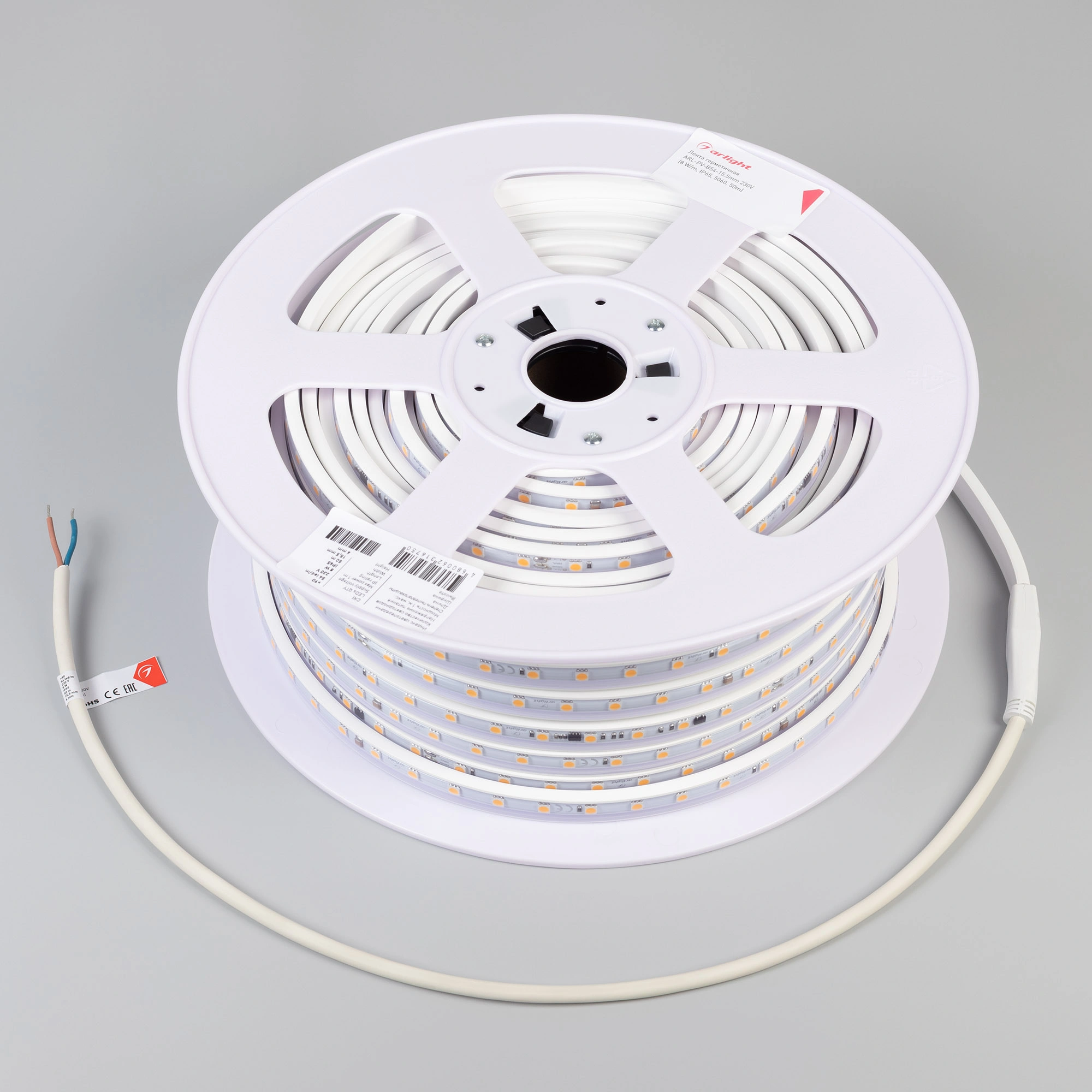 Светодиодная герметичная лента ARL серии B54 шириной 15.5 мм, мощностью 8 Вт/м, степень защиты IP65, в прозрачной ПВХ-трубке, оболочка ленты имеет защиту от УФ излучения, что позволяет использовать ее на улице. Светодиоды SMD 5060, 54 шт/м, белого цвета свечения (4000K). Высокий индекс цветопередачи CRI>90 обеспечивает точное восприятие цветовых оттенков. Лента подключается напрямую к сети переменного тока 230 В и не требует использования источников питания. Использование интегральных стабилизаторов тока позволяет подключать ленту длиной до 50м, обеспечивая при этом равномерную яркость свечения по всей длине ленты. При подключении нескольких лент, подавать питание на каждые 50м отдельным кабелем. Запрещается последовательное подключение лент более 50м. Предназначена для декоративной подсветки на улице и в помещениях, создания контуров рекламных объектов, подсветки потолочных ниш. На лентах установлены микросхемы с функцией снижения тока для защиты ленты от перегрева, что обеспечивает надежную работу лент в различных условиях. Диммирование осуществляется диммерами TRIAC в диапазоне 15%-90%. Крепление с помощью скоб, аксессуары для монтажа и подключения поставляются отдельно. Катушка 50 м.