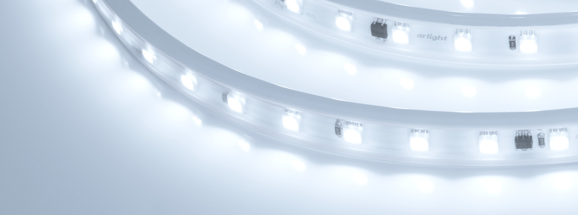 Светодиодная герметичная лента ARL серии B54 шириной 15.5 мм, мощностью 8 Вт/м, степень защиты IP65, в прозрачной ПВХ-трубке, оболочка ленты имеет защиту от УФ излучения, что позволяет использовать ее на улице. Светодиоды SMD 5060, 54 шт/м, белого цвета свечения (6000K). Высокий индекс цветопередачи CRI>90 обеспечивает точное восприятие цветовых оттенков. Лента подключается напрямую к сети переменного тока 230 В и не требует использования источников питания. Использование интегральных стабилизаторов тока позволяет подключать ленту длиной до 10м, обеспечивая при этом равномерную яркость свечения по всей длине ленты. При подключении нескольких лент, подавать питание на каждые 10м отдельным кабелем. Запрещается последовательное подключение лент более 10м. Предназначена для декоративной подсветки на улице и в помещениях, создания контуров рекламных объектов, подсветки потолочных ниш. На лентах установлены микросхемы с функцией снижения тока для защиты ленты от перегрева, что обеспечивает надежную работу лент в различных условиях. Диммирование осуществляется диммерами TRIAC в диапазоне 15%-90%. Крепление с помощью скоб, аксессуары для монтажа и подключения поставляются отдельно. Катушка 10 м.