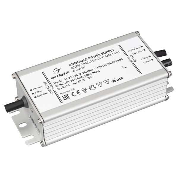 Характеристики - Блок питания ARPV-UH24100-PFC-DALI-PH (24V, 4.2A, 100W) (Arlight, IP67 Металл, 7 лет)