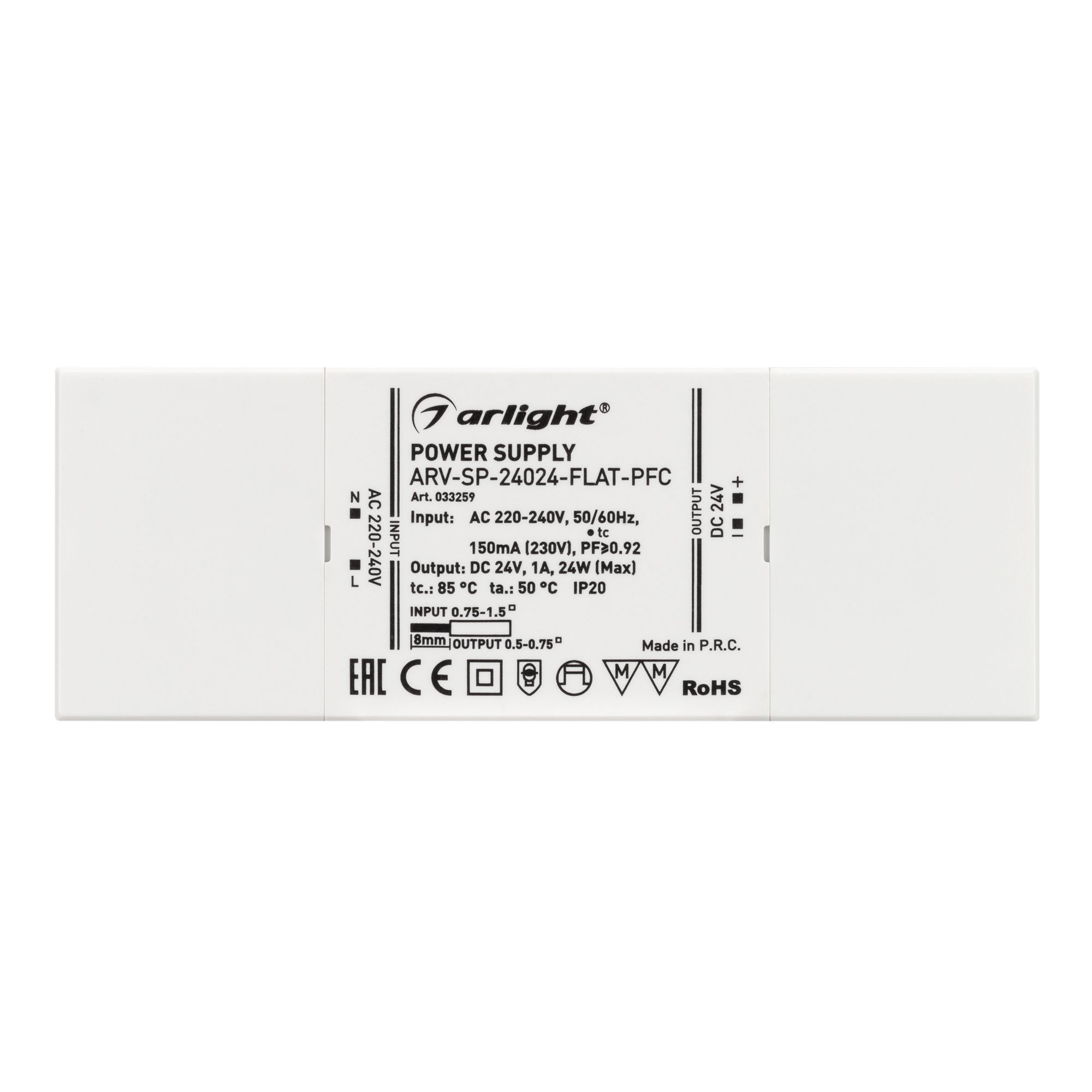 Характеристики - Блок питания ARV-SP-24024-FLAT-PFC (24V, 1A, 24W) (Arlight, IP20 Пластик, 5 лет)