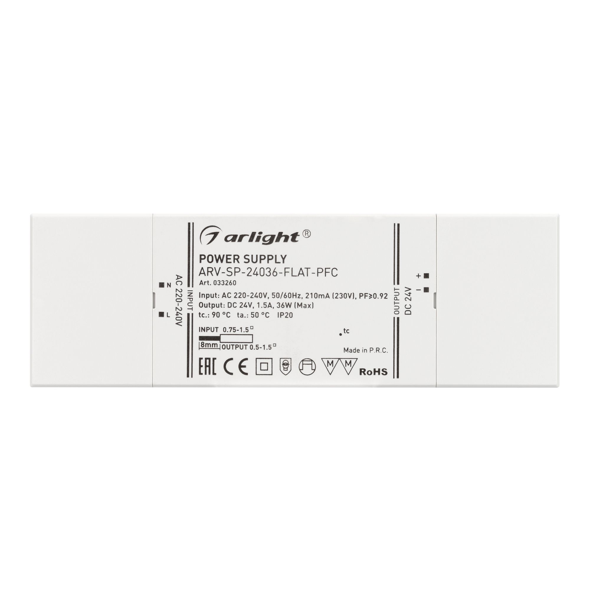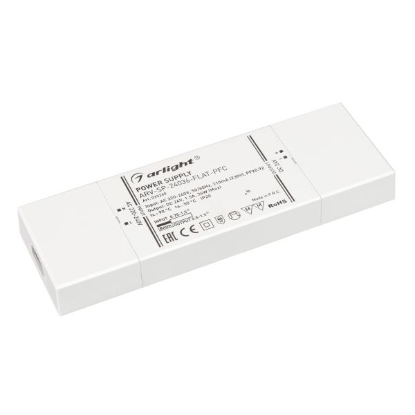 Характеристики - Блок питания ARV-SP-24036-FLAT-PFC (24V, 1.5A, 36W) (Arlight, IP20 Пластик, 5 лет)