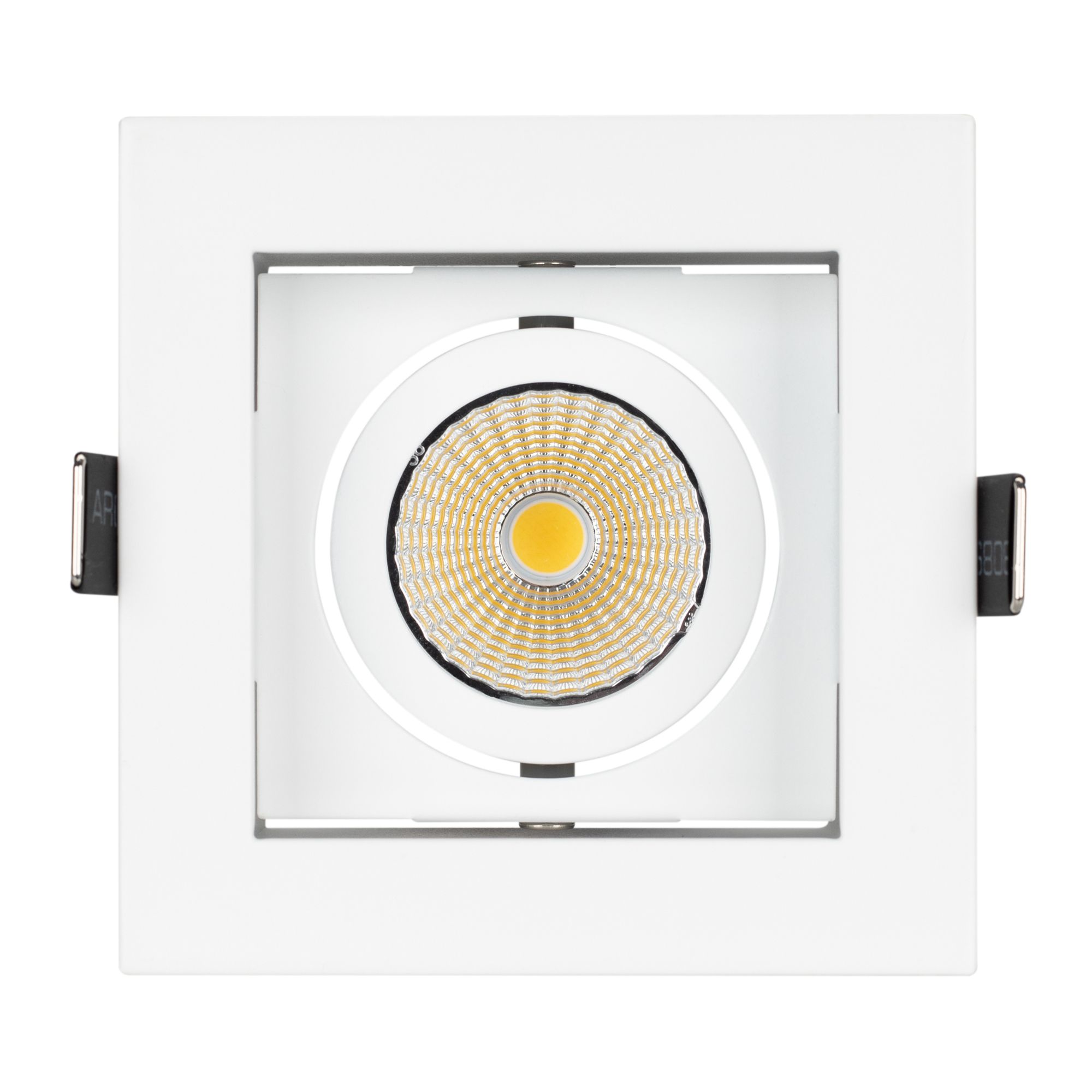 Встраиваемый карданный поворотный светильник с высоким индексом цветопередачи CRI>80 предназначен для создания качественного направленного освещения. За основу поворотного механизма светильника взят принцип кардана – подвижное соединение двух колец, вложенных одно в другое. Световой модуль отклоняется на 45 градусов, что позволяет с лёгкостью регулировать направление пучка света и его концентрацию на определенной зоне. Особая конфигурация корпуса из алюминия оригинально смотрится в интерьере и позволяет эффективно отводить тепло. Светильник с узким углом рассеивания 38 градусов и световым потоком 680 лм отлично подходит для локальной акцентной подсветки витрин, прилавков магазинов, бутиков и стендов выставочных залов. Легко устанавливается с помощью пружин в монтажное отверстие потолка. В комплекте поставляется драйвер, что позволяет безопасно и быстро подключать светильник напрямую к сети переменного тока 230 В. Диммирование возможно при замене штатного драйвера.