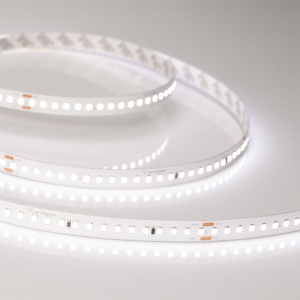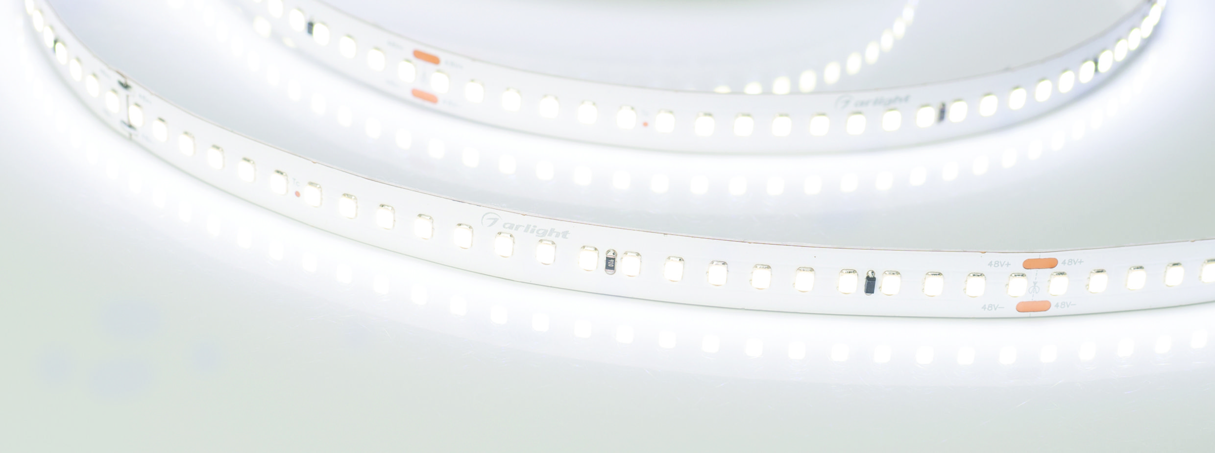 Стабилизированная лента длиной 50 метров и шириной 12 мм. Стабилизаторы тока обеспечивают равномерное свечение по всей длине ленты даже при подключении только с одной стороны. Светодиоды SMD 2835 (144 шт/м) дневного белого цвета свечения (3800–4200 K) с индексом цветопередачи CRI>85. Мощность 5.8 Вт/м, напряжение питания 48 В. Подсветка потолочных ниш, декоративная подсветка, создание контуров рекламных объектов. Совместима с любыми диммерами (ШИМ). Минимальный отрезок 166.67 мм (24 светодиода).