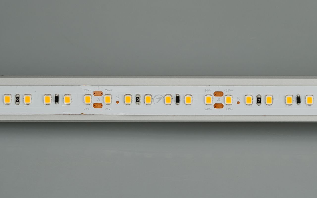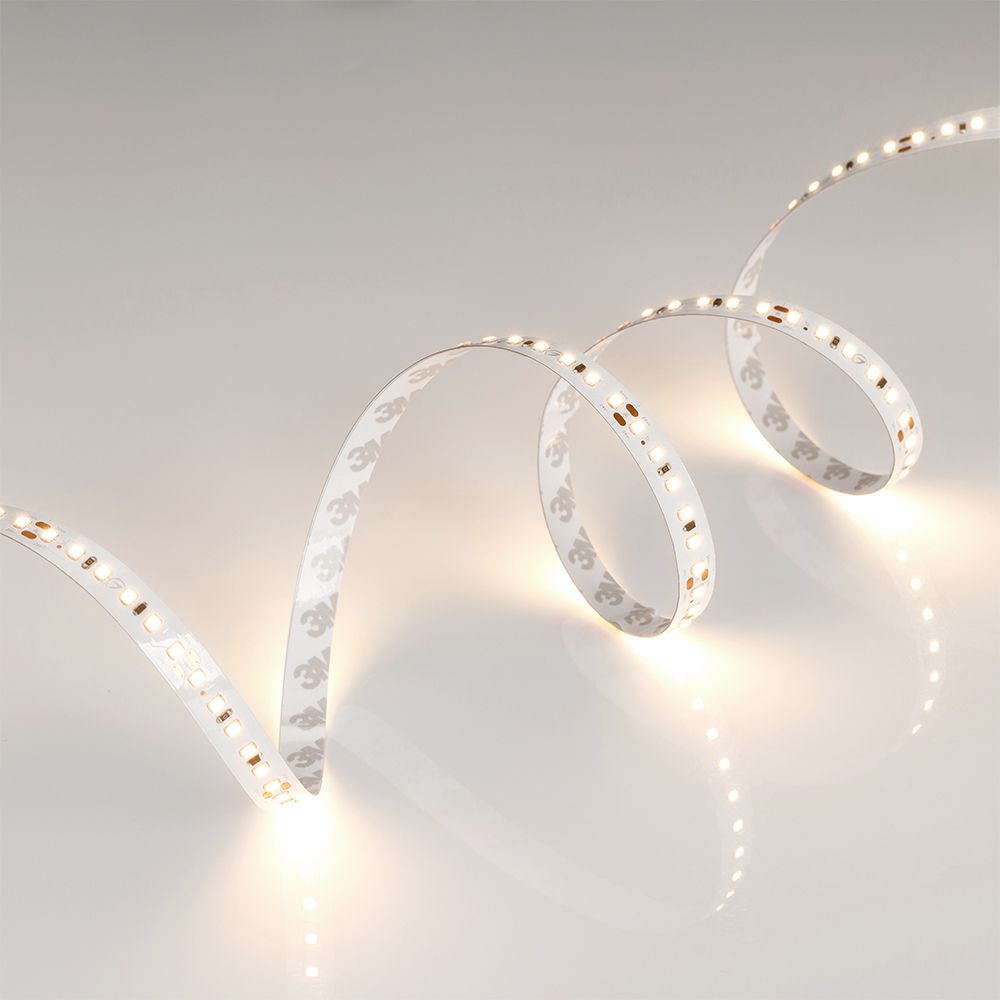 Стабилизированная лента длиной 20 метров и шириной 12 мм. Стабилизаторы тока обеспечивают равномерное свечение по всей длине ленты даже при подключении только с одной стороны. Светодиоды SMD 2835 (120 шт/м) теплого белого цвета свечения (2600–2800 K) с индексом цветопередачи CRI>85. Мощность 9.6 Вт/м, напряжение питания 24 В. Подсветка потолочных ниш, декоративная подсветка, создание контуров рекламных объектов. Совместима с любыми диммерами (ШИМ). Минимальный отрезок 50 мм (6 светодиодов).