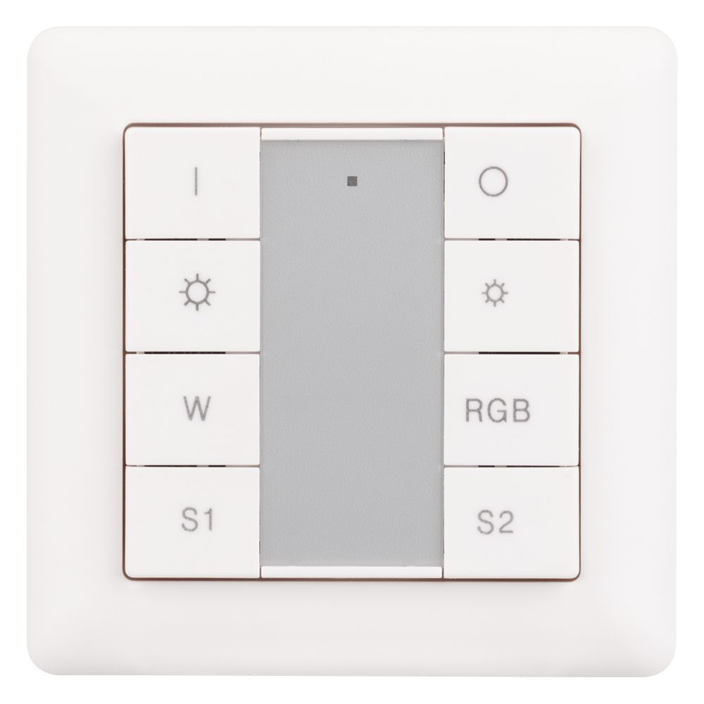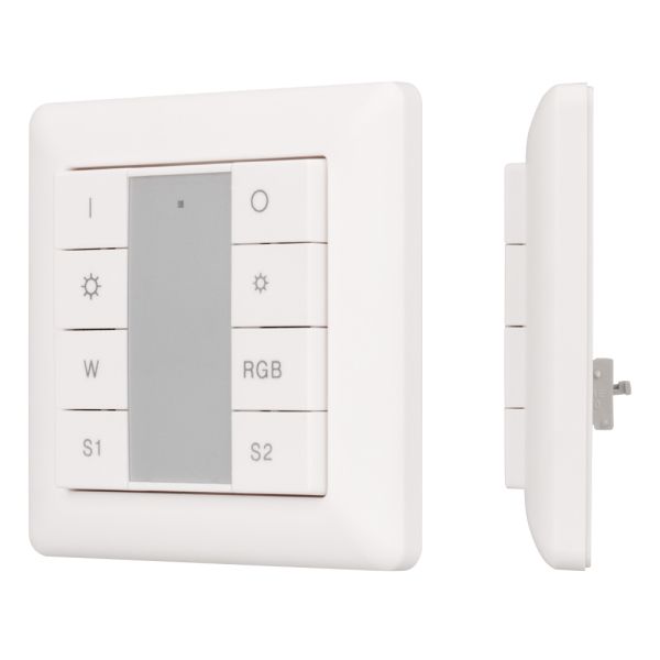 Встраиваемая пластиковая панель белого цвета с кнопочным управлением, предназначенная для управления мультицветными RGBW светодиодными лентами, светильниками и другими источниками света в системах управления светом DALI DT8. Позволяет включать/выключать свет, менять его яркость и управлять цветом в 1 группе либо в режиме широковещателя (Broadcast). Сохранение и вызов 2 сцен. Установка номера группы и сцен выполняется переключателями на задней стороне панели. Устройство совместимо с диммерами стандарта DALI. Передача команд от панели к диммерам выполняется по общей двухпроводной шине DALI. Удобное и точное управление при помощи отдельных механических кнопок для каждой функции. Питание от шины DALI. Габариты устройства составляют 81х81х22.5 мм. Панель совместима с декоративными рамками ведущих мировых производителей (GIRA, JUNG, BERKER, MERTEN). Стандартная рамка входит в комплект поставки.