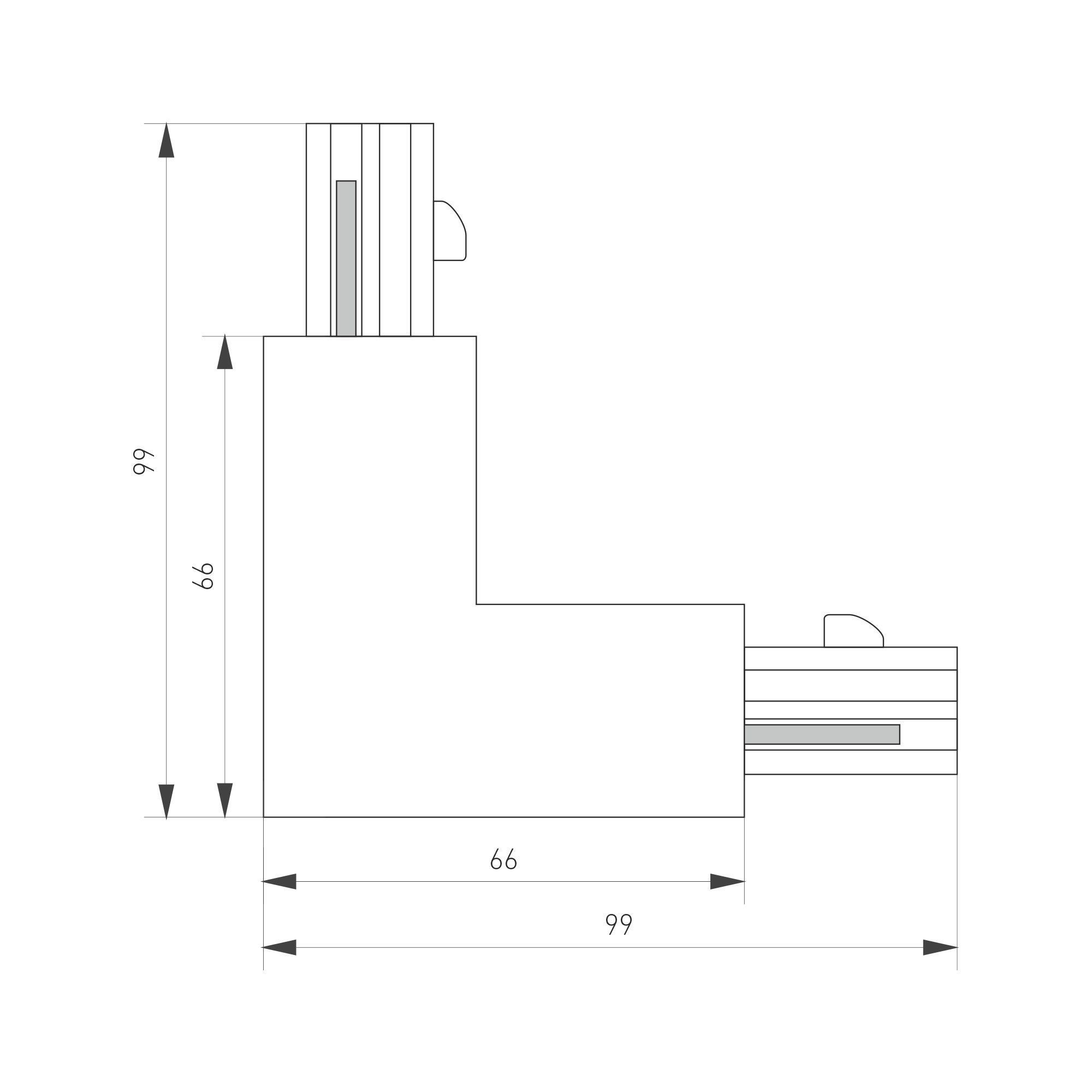 Угловой коннектор 90 градусов, питание по внешней стороне. Цвет черный. 99х99х33 мм с контактами, 66х66х33 мм без контактов. При использовании с треками и аксессуарами другой серии возможно отличие по цвету.