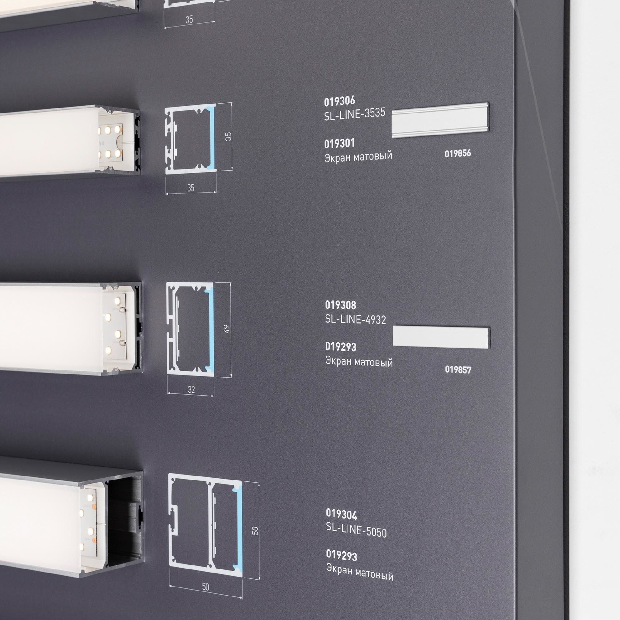 На стенде представлен ассортимент накладных/подвесных алюминиевых профилей для светодиодных лент для создания основного освещения.