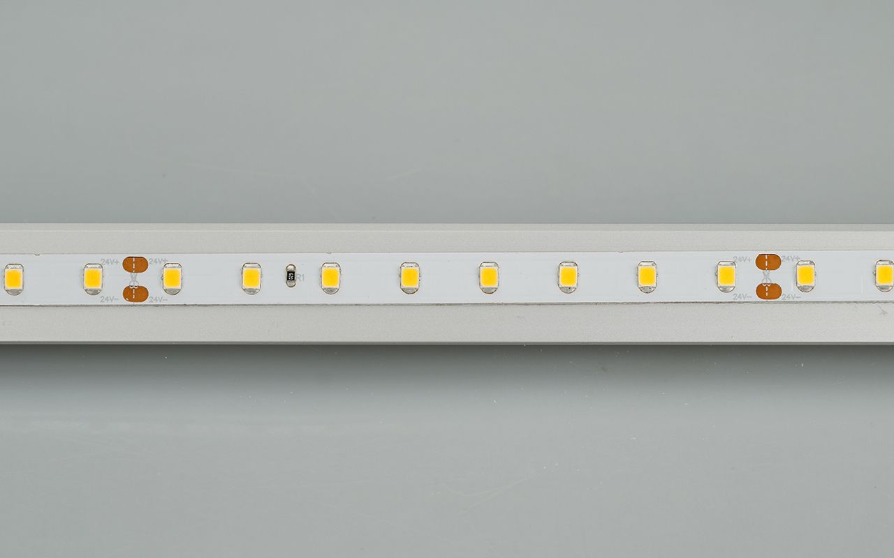Открытая светодиодная лента шириной 8 мм и мощностью 6 Вт/м с индексом цветопередачи CRI>85. Светодиоды SMD 2835 (80 шт/м) теплого белого цвета свечения (2600–2800 К). Напряжение питания 24 В. Минимальный отрезок 100 мм (8 светодиодов). Высокая световая эффективность 150 лм/Вт позволяет создать качественное освещение в любых помещениях. Лента применяется для декоративной подсветки интерьеров, потолочных ниш, рабочих зон кухни, мебели, а также подходит для подсветки рекламных конструкций и витрин.