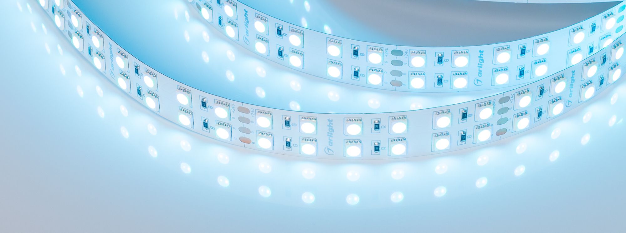 Широкая двухрядная мультицветная лента RT серии B144, шириной 19 мм с RGB-светодиодами SMD 5060 (144 шт/м). Мощность 34.4 Вт/м, напряжение питания 24 В. Предназначена для оформление клубов, залов, ресторанов. Создания световых линий с изменяемым цветом свечения. Подходит для помещений с высокими потолками. Управляется RGB-контроллером. Минимальный отрезок 83.33 мм (12 светодиодов). Обязательна установка на алюминиевый профиль.