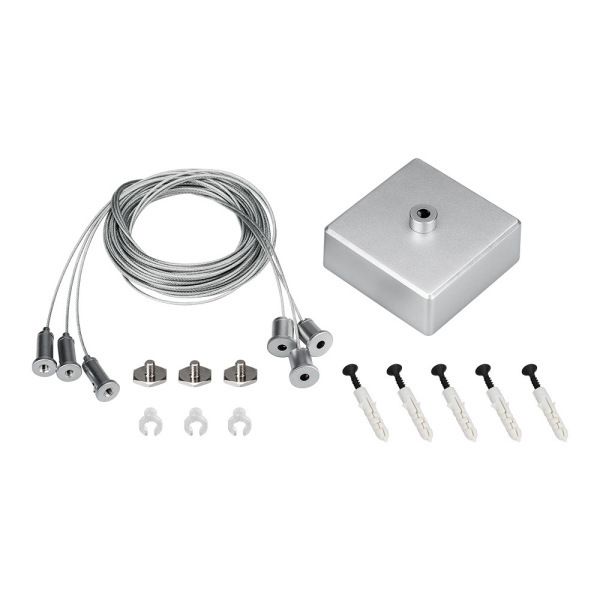Набор для подвеса профилей S2-LINE 4067, 5470, 7977, 10570 длиной от 2 м до 2,5 м. Квадратная потолочная чаша (80х80х36 мм) скрывает место вывода провода питания. Три регулируемых троса длиной 4 метра позволяют легко зафиксировать конструкцию на необходимом расстоянии от потолка.