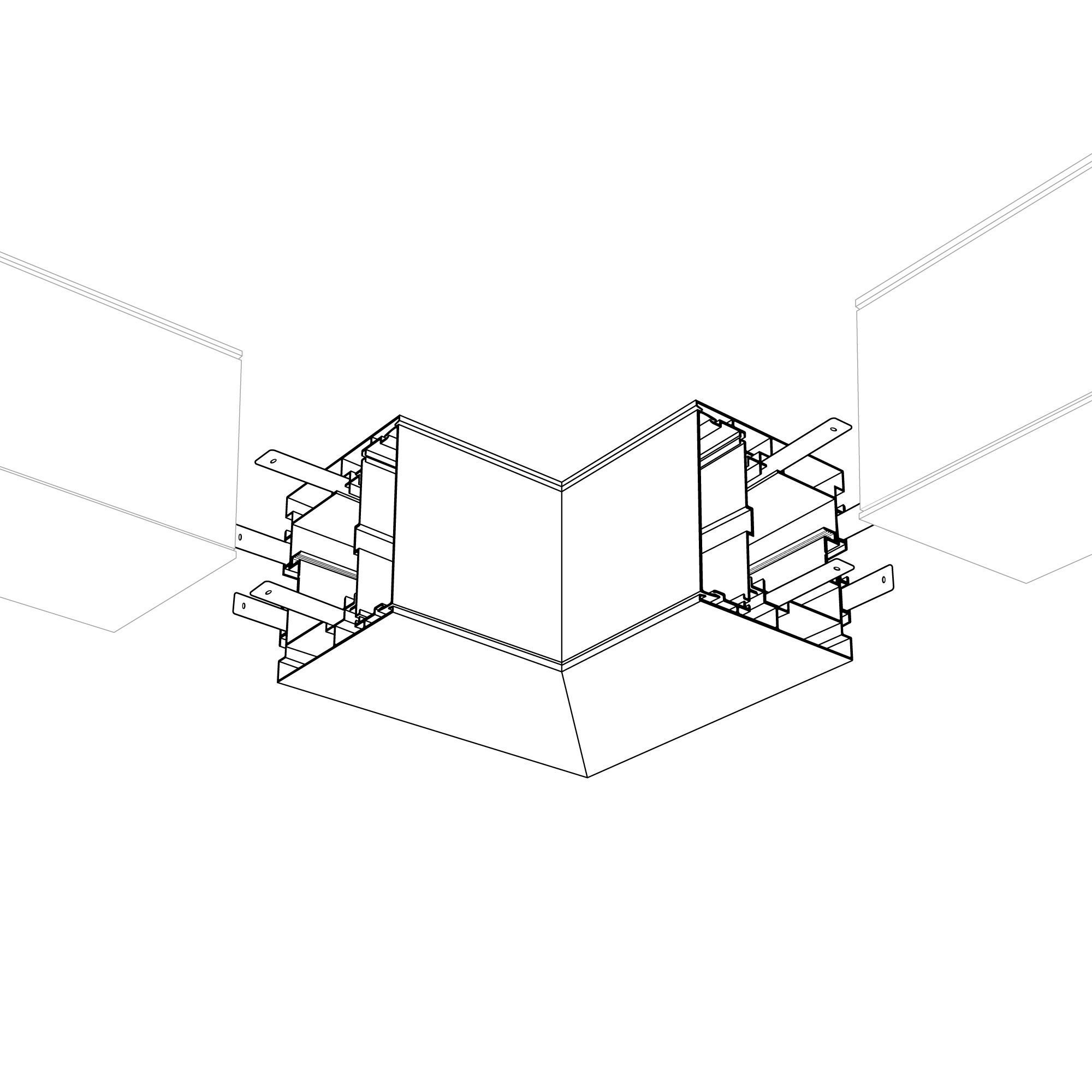 Внутренний прямой угол в сборе для соединения двух профилей S2-LINE-7977 под прямым углом 90° в разных плоскостях в комплекте с матовым экраном, площадкой для ленты и соединителями. Экран образует линию внутри угла. Применятся при изготовлении светильников сложной геометрии. Длина внешней стороны угла 150мм. Цена за комплект.