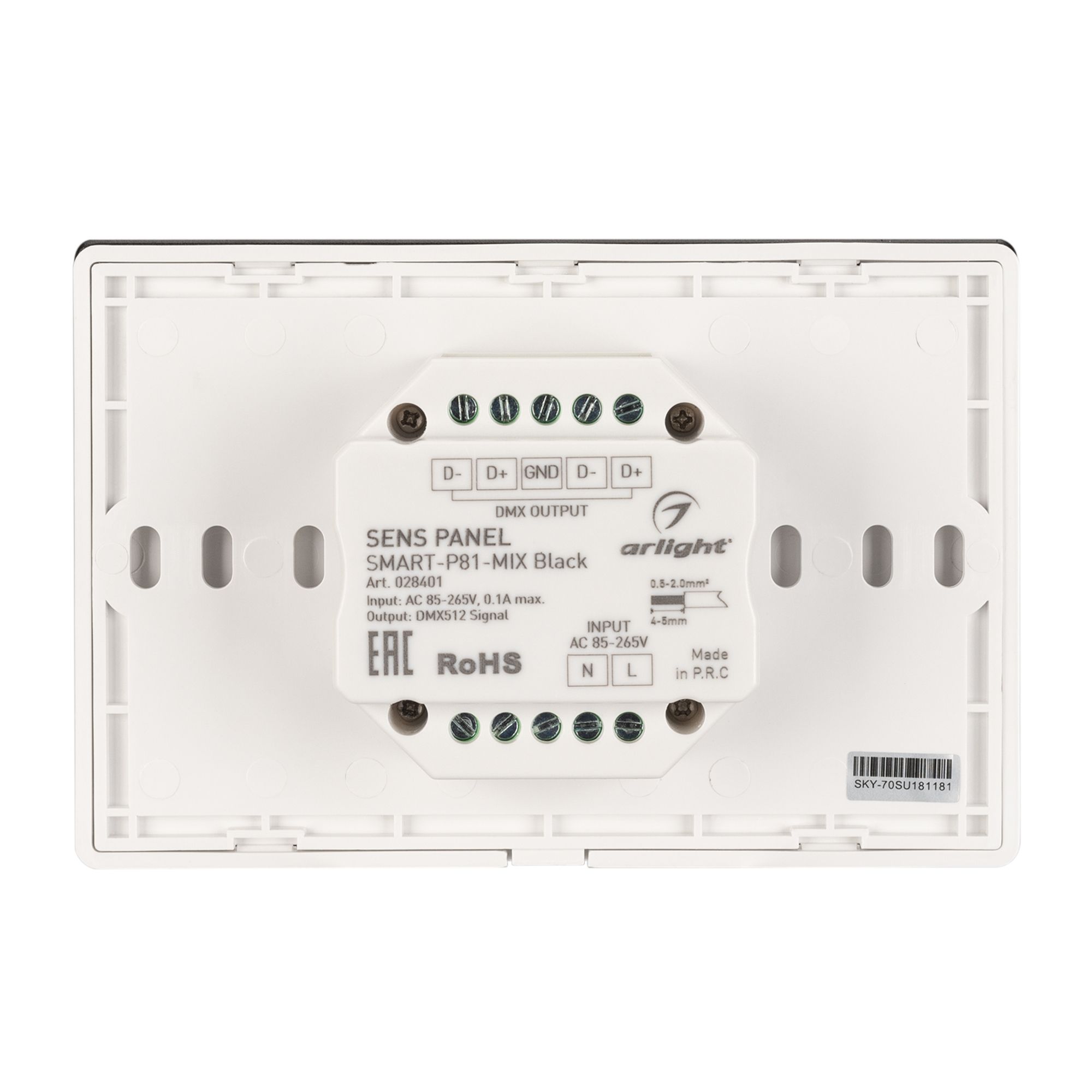 Встраиваемая сенсорная панель в "итальянском" стиле, изготовленная из высококачественного стекла, защищенного от появления царапин. Изделие позволяет осуществлять основные функции управления светом: включение/выключение, регулировка яркости, регулировка цветовой температуры, сохранение предустановок для 4 световых зон. Панель совместима с диммерами и контроллерами SMART по радиоканалу 2.4G (количество привязываемых диммеров и контроллеров не ограничено) и может управлять DMX-диммерами по проводной шине DMX512. Выходной сигнал DMX соответствует стандартному протоколу DMX512 и совместим с оборудованием DMX любого производителя. Панель чёрного цвета, питание от сети 230В. Габариты устройства 120х80х37 мм, встраивается в стандартную монтажную коробку.