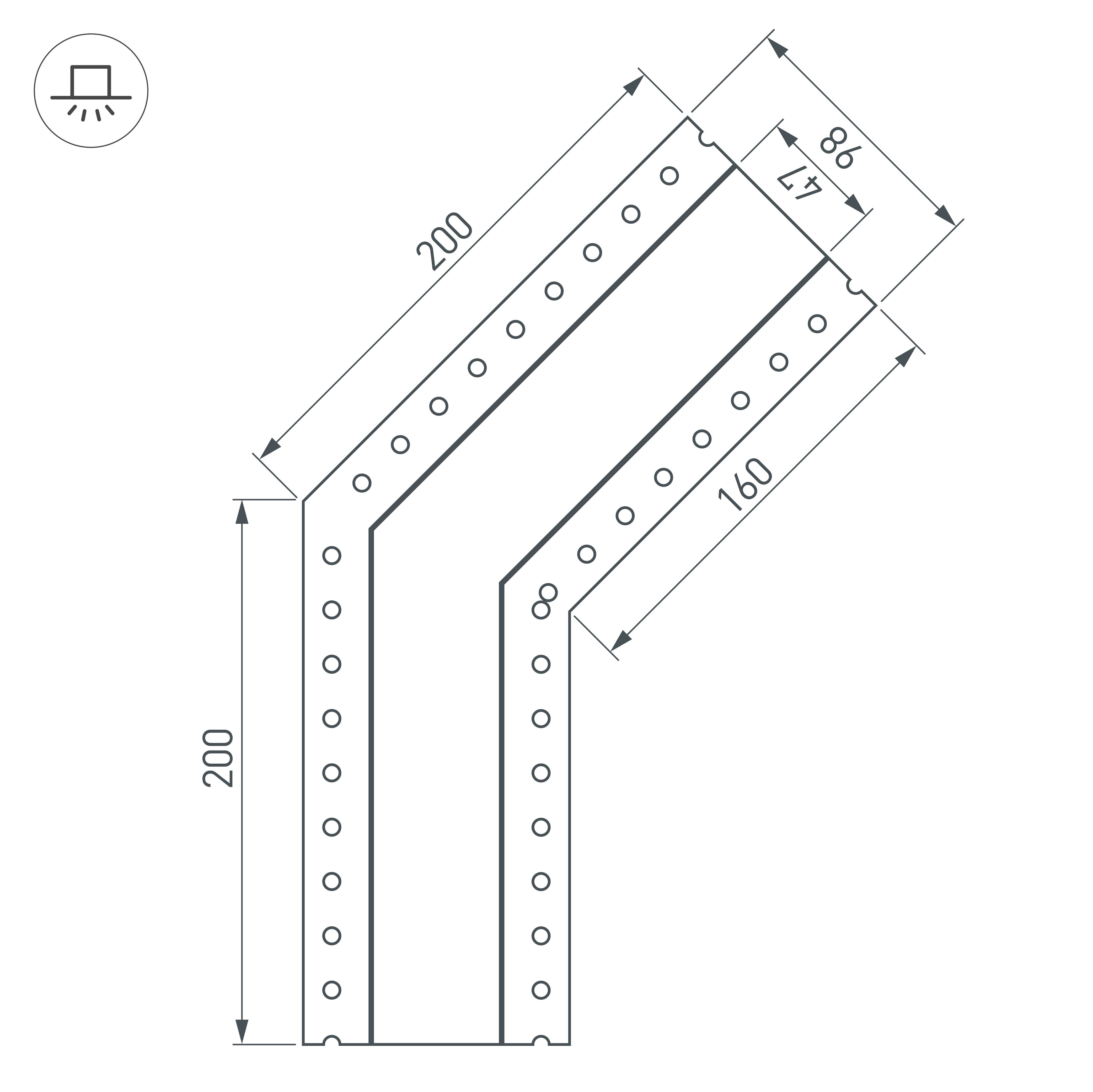 Угол в сборе со скрытым фланцем под строительную отделку для соединения двух профилей SL-LINIA45-FANTOM под углом 135° в одной плоскости в комплекте с матовым экраном и соединителями. Экран образует линию на плоскости. Применятся при изготовлении светильников сложной геометрии. Длина внешней стороны угла 200мм. Цена за комплект.