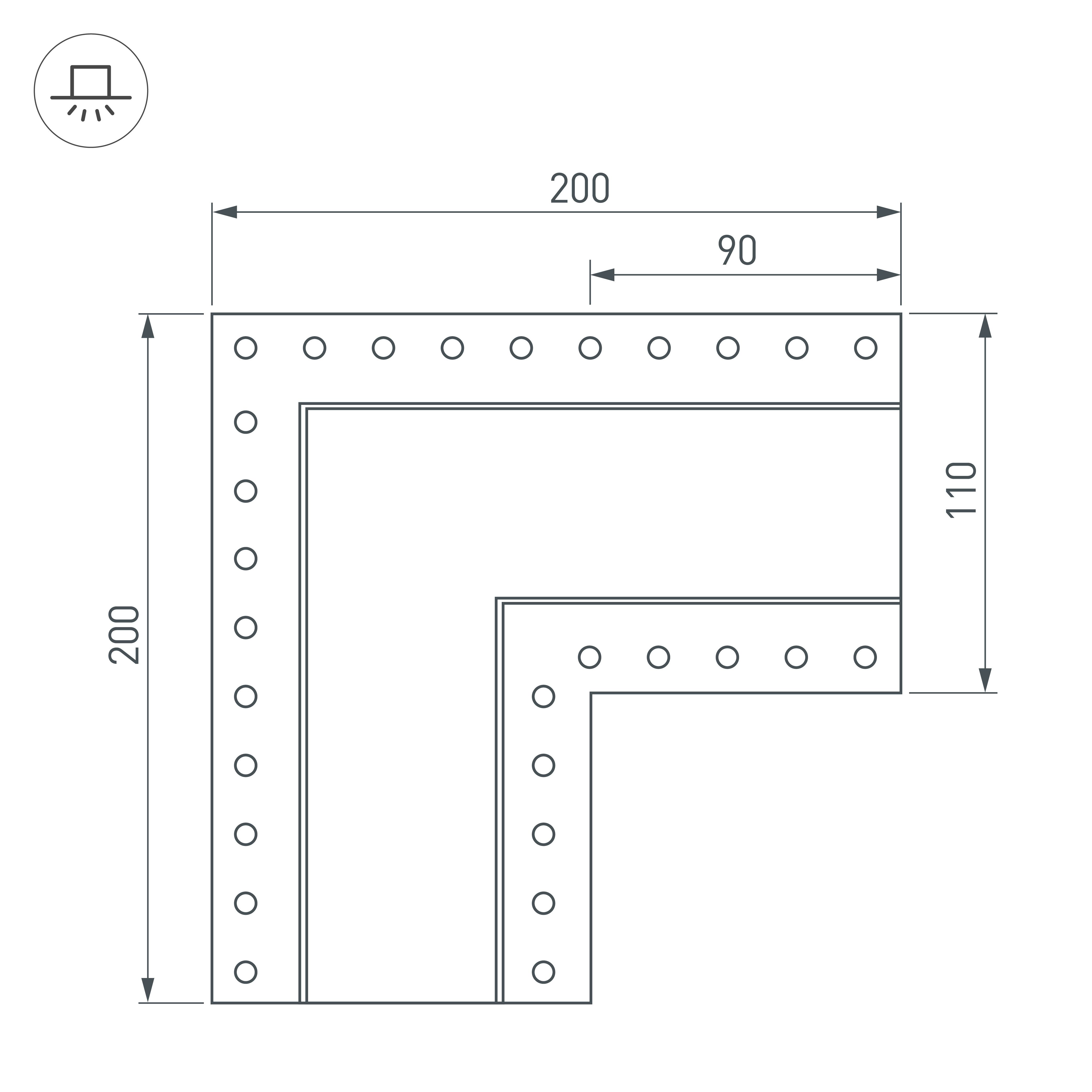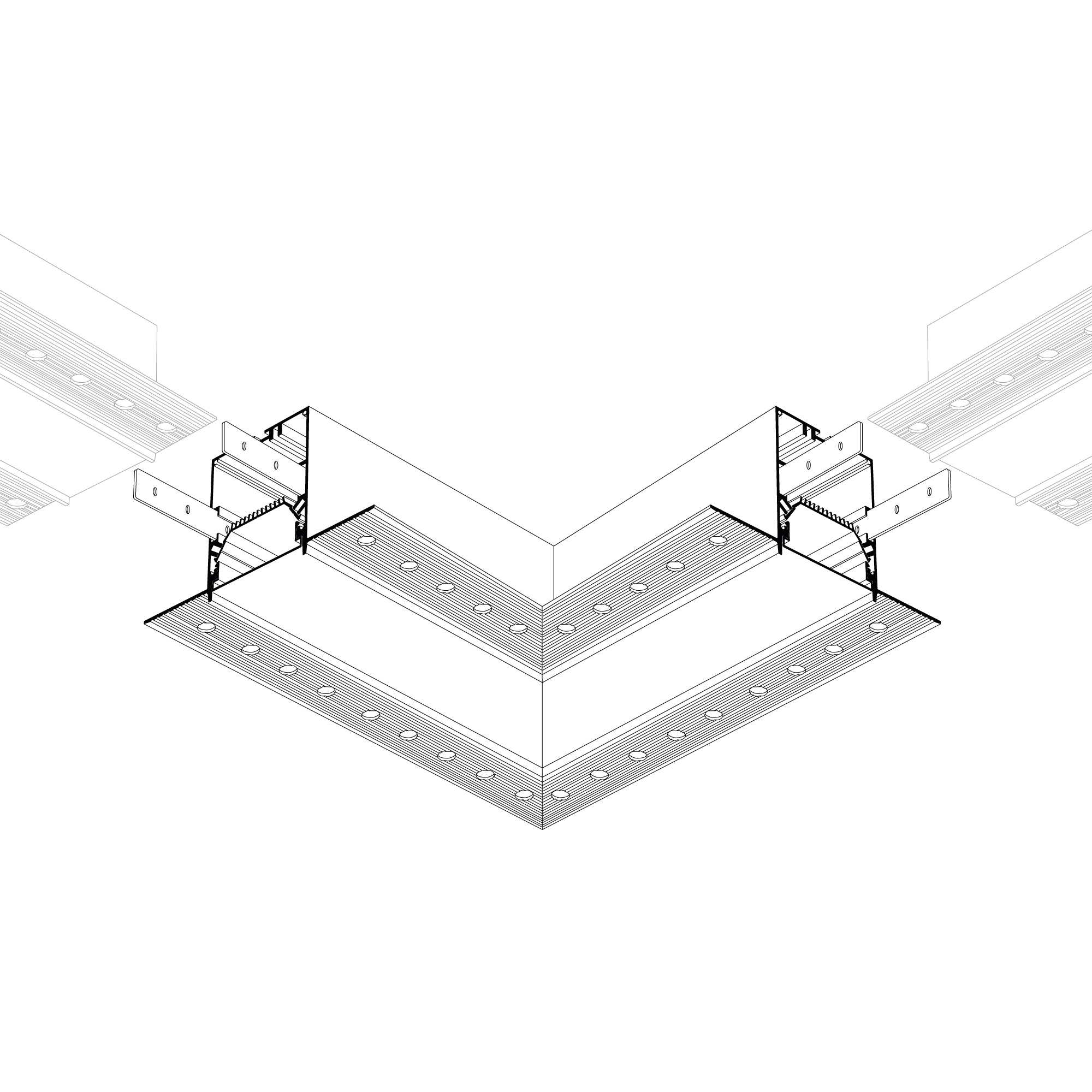 Прямой угол в сборе со скрытым фланцем под строительную отделку для соединения двух профилей SL-LINIA55-FANTOM под прямым углом 90° в одной плоскости в комплекте с матовым экраном и соединителями. Экран образует линию на плоскости. Применятся при изготовлении светильников сложной геометрии. Длина внешней стороны угла 200мм. Цена за комплект.