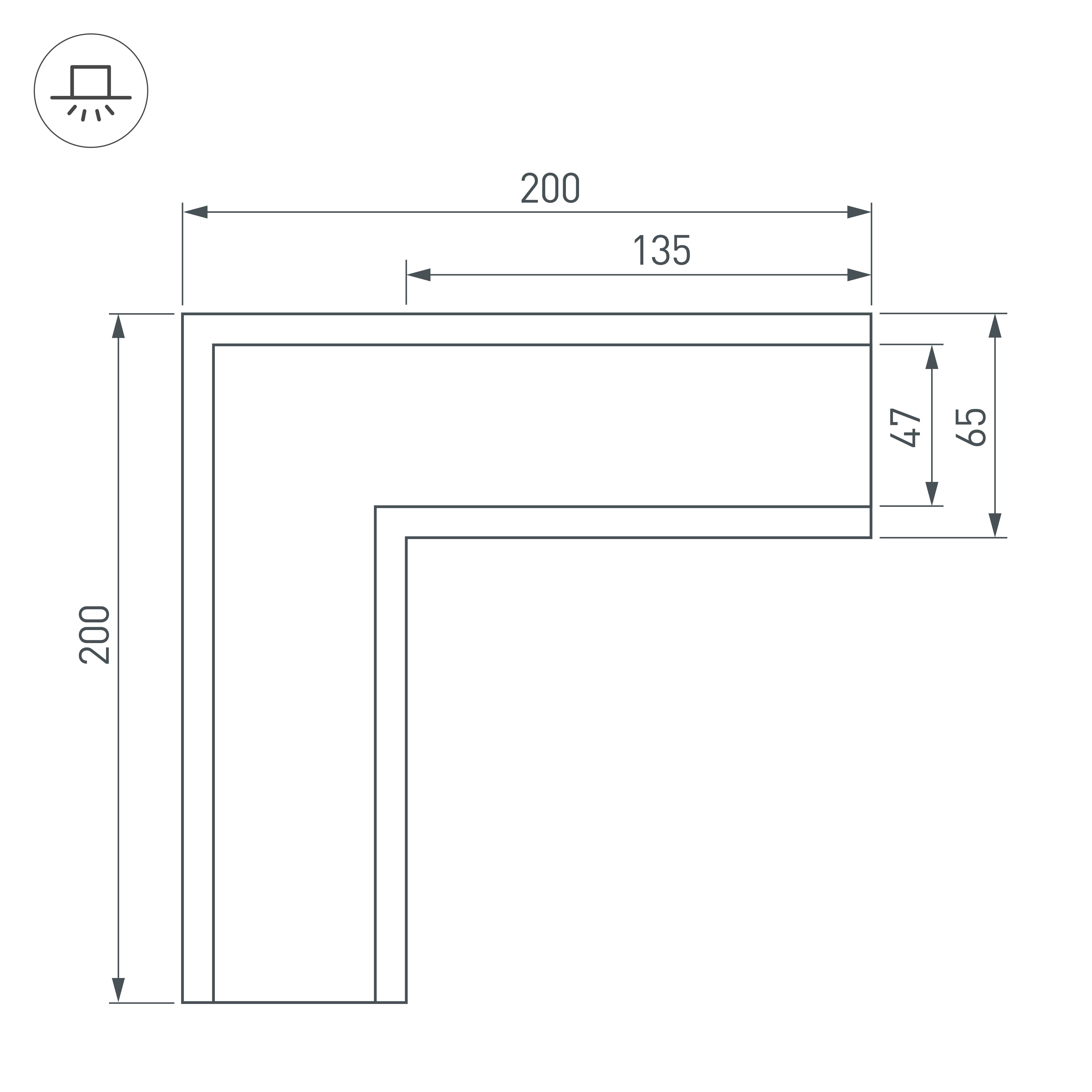 Прямой угол в сборе с накладным фланцем для соединения двух профилей SL-LINIA65-F под прямым углом 90° в одной плоскости в комплекте с матовым экраном и соединителями. Экран образует линию на плоскости. Применятся при изготовлении светильников сложной геометрии. Длина внешней стороны угла 200мм. Цена за комплект.