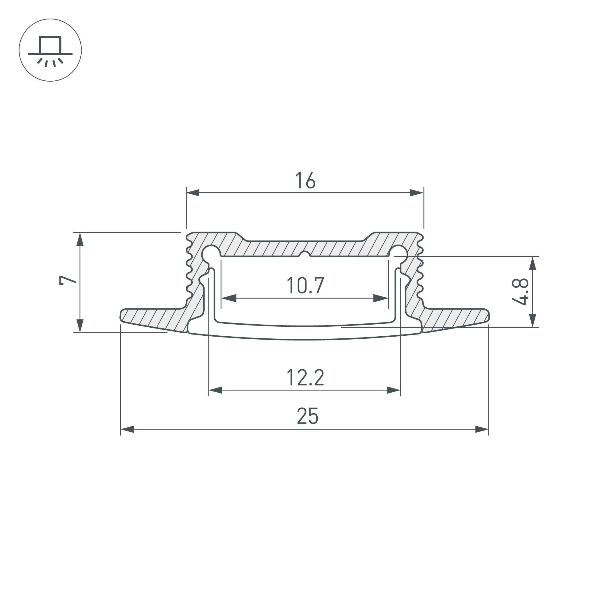 Встраиваемый профиль с накладным фланцем из анодированного алюминия для подсветки мебели, пазов, ниш и других элементов интерьера. Габаритные размеры профиля составляют 2000 мм в длину, 25 мм в ширину и 7 мм в высоту. Площадка для установки светодиодных лент позволяет использовать ленту шириной до 10,7 мм и мощностью до 14,6 Вт/м. Это обеспечивает гибкость в выборе светодиодных лент и создает потрясающие световые решения. Экран, заглушки и другие аксессуары не включены в комплект и приобретаются отдельно. Цена указана за 1 метр профиля. Отличное решение для создания современных световых проектов.