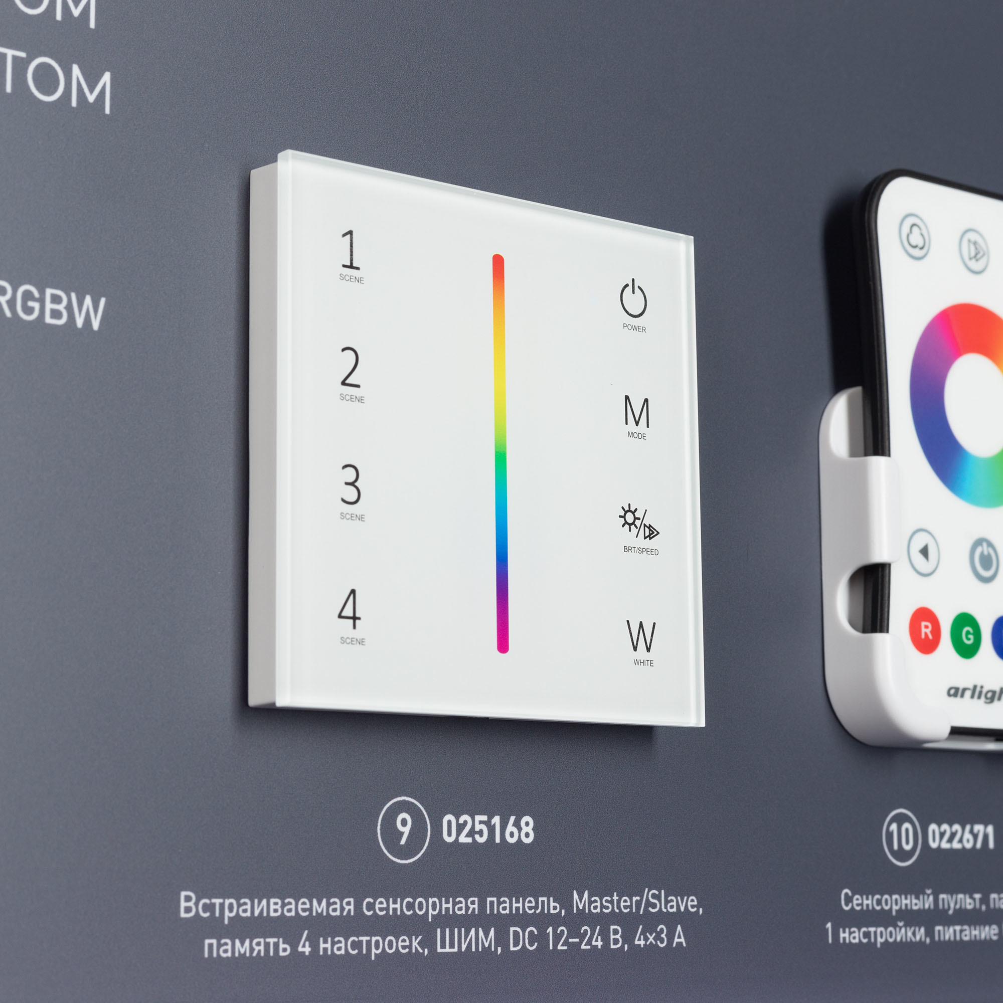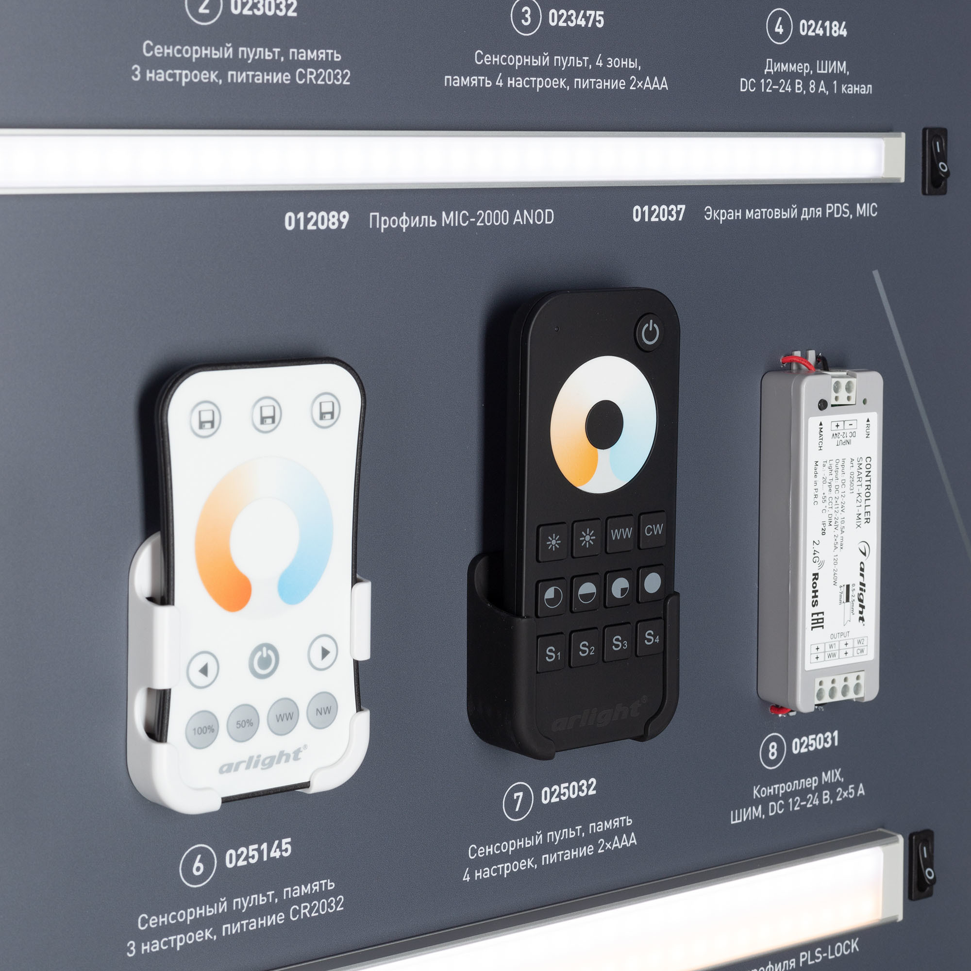 На стенде показаны возможности управления светодиодными лентами DIM, MIX, RGBW, RGB+MIX с помощью устройств серии SMART.