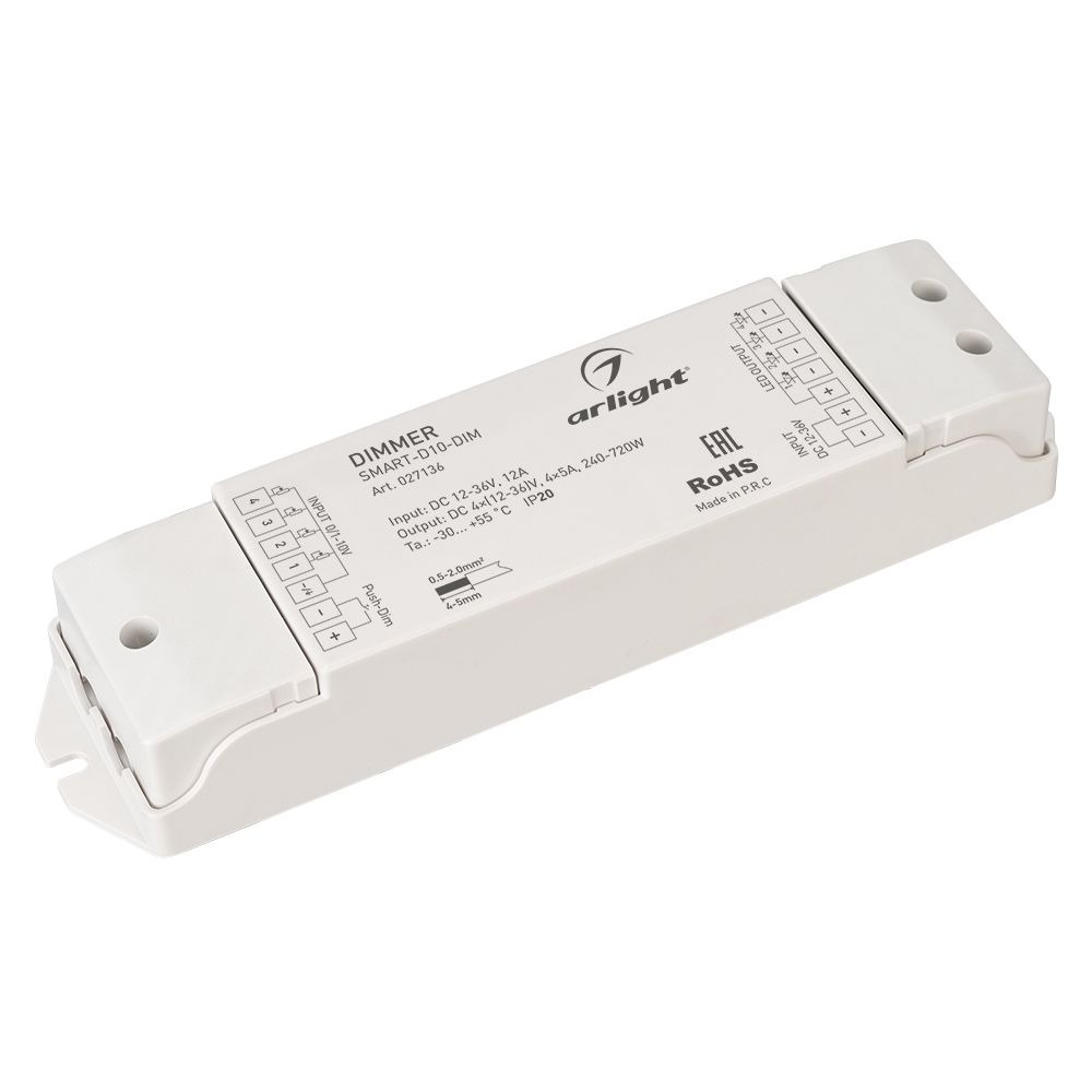 Характеристики - Диммер SMART-D10-DIM (12-36V, 4x5A, 0/1-10V) (Arlight, IP20 Пластик, 5 лет)