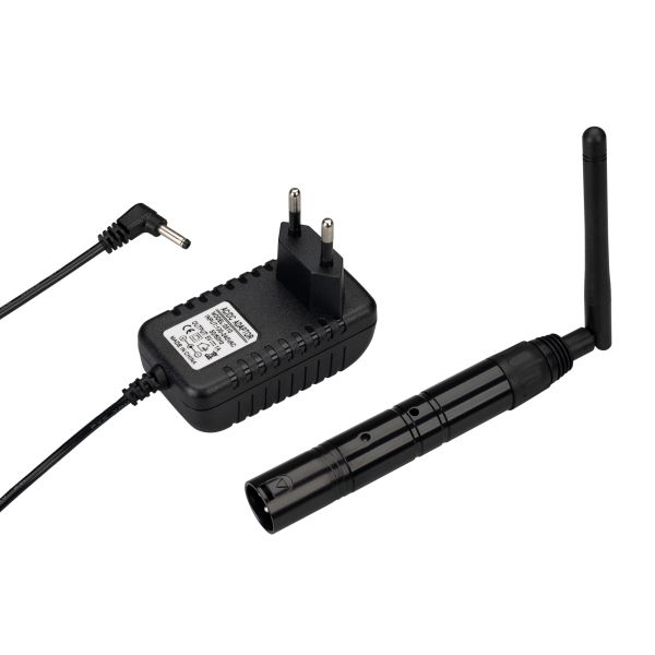 Беспроводной передатчик сигнала DMX512, работающий в паре с беспроводным приёмником сигнала 028417. Устройство обеспечивает стабильную передачу сигнала на расстоянии до 400 метров до приёмника. Устройство оснащено разъемом XLR3 Male, что делает его совместимым с большим количеством декодеров, имеющих аналогичный разъем. Напряжение питания составляет всего 5В, обеспечиваемое надежным блоком питания, которым укомплектовано изделие. Габариты устройства составляют 219x19x19 мм, металлический корпус чёрного цвета.