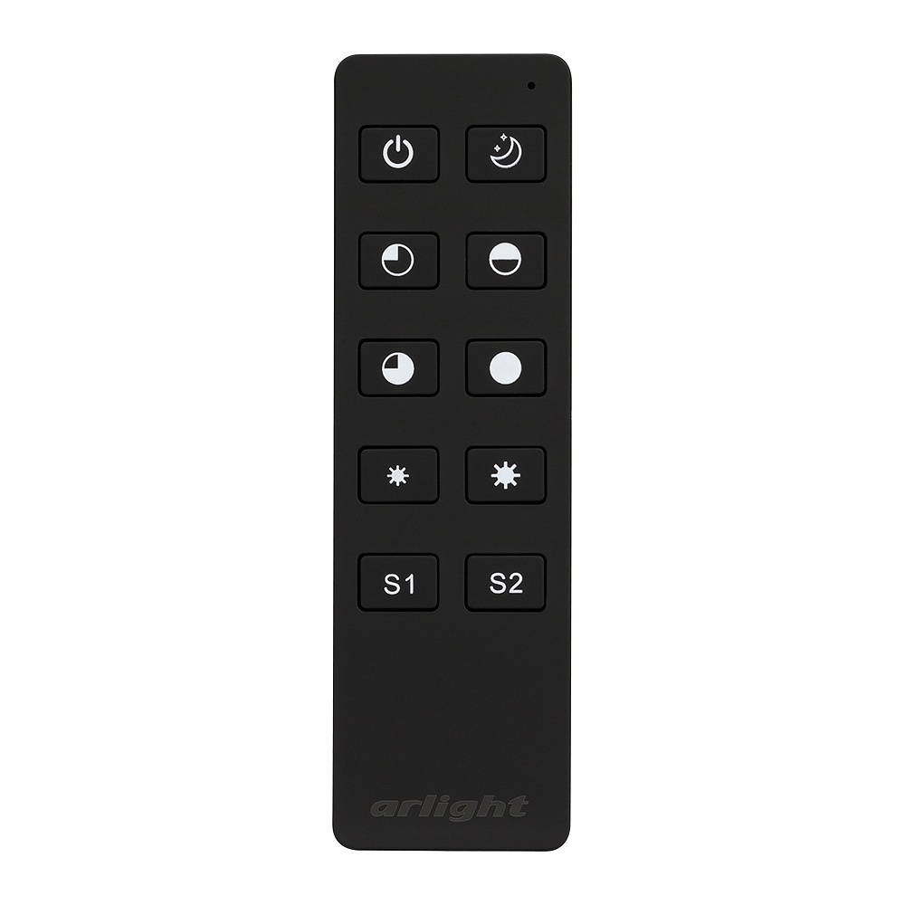 Кнопочный радиочастотный пульт чёрного цвета, предназначенный для управления одноцветными источниками света. Поддерживает основные функции: включение и выключение света, регулировку яркости, ночной режим, управление 1 световой зоной, включение и выключение 2-х пользовательских световых сцен. Устройство совместимо с диммерами и контроллерами серии SMART, поддерживающими управление по радиоканалу 2.4G. К одному пульту возможно привязать неограниченное количество диммеров и контроллеров. Питание 3В осуществляется от батарейки CR2032. Корпус пульта выполнен из пластика с покрытием Soft-Touch. Габариты устройства 135x40x11 мм.