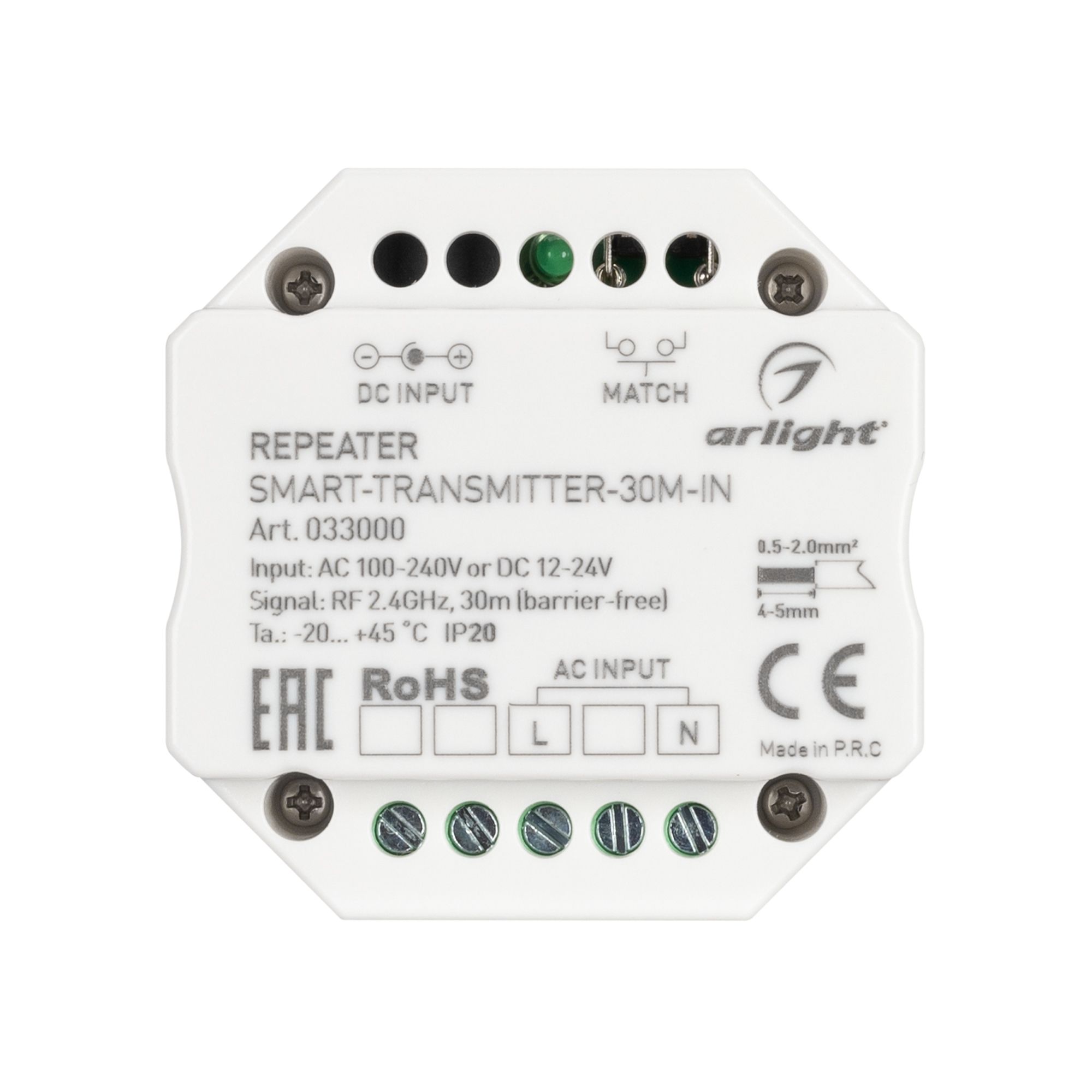 Характеристики - Контроллер-усилитель SMART-TRANSMITTER-30M-IN (230V, 2.4G) (Arlight, IP20 Пластик, 5 лет)