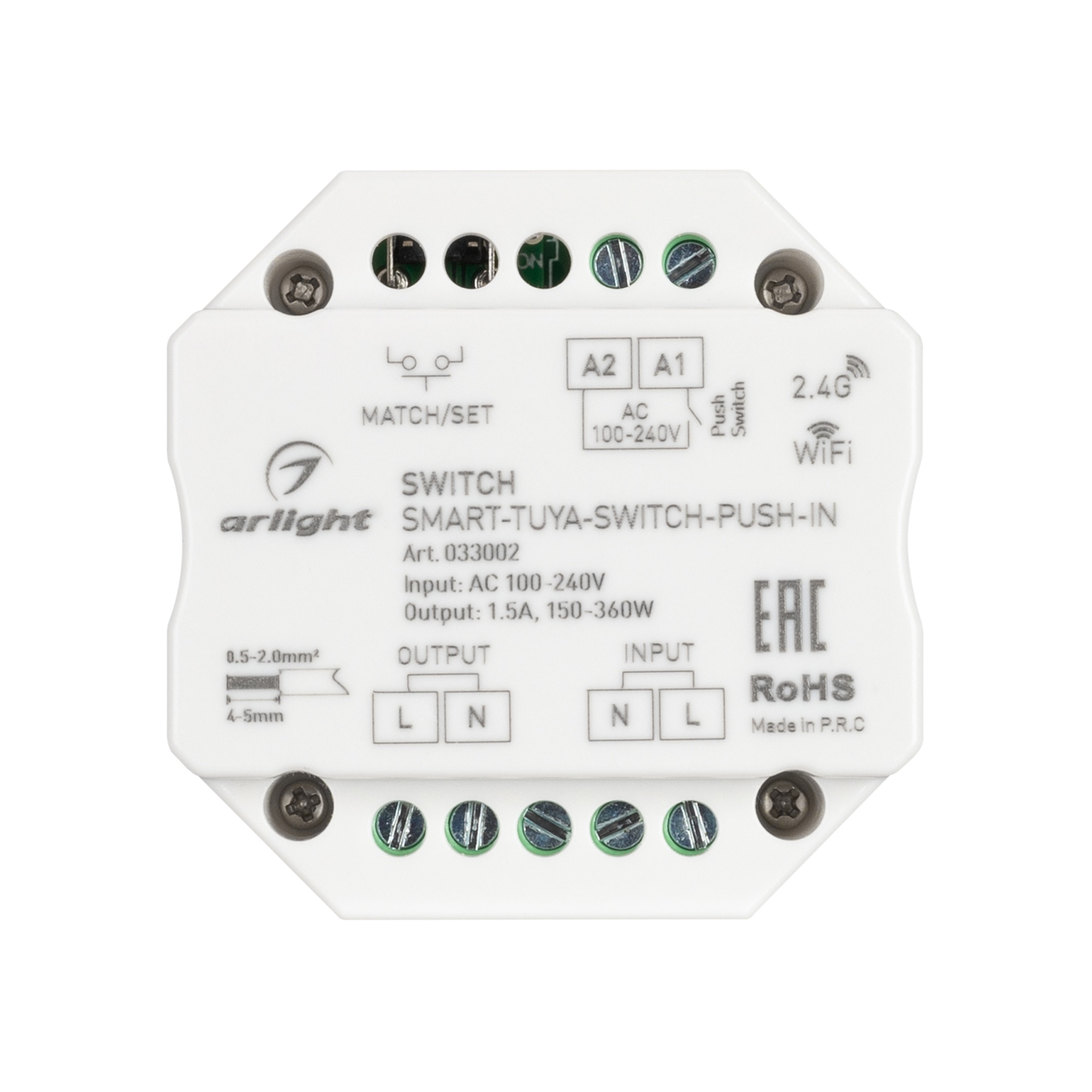 Характеристики - Контроллер-выключатель SMART-TUYA-SWITCH-PUSH-IN (230V, 1.5A, WiFi, 2.4G) (Arlight, IP20 Пластик, 5 лет)