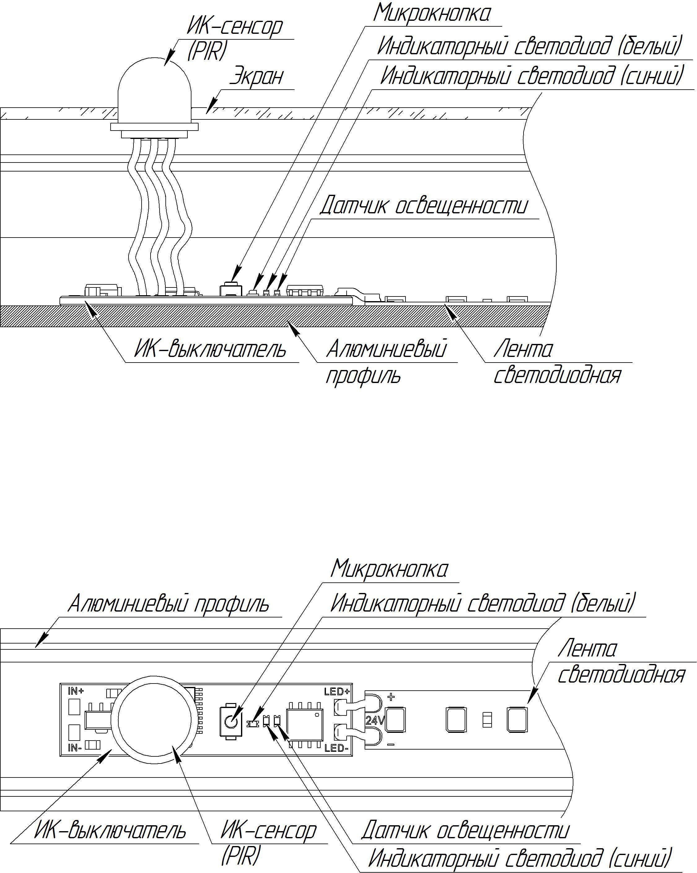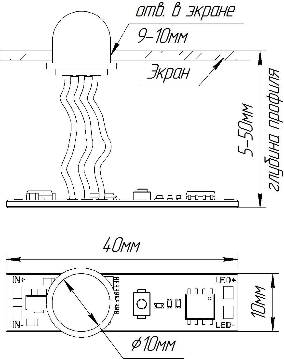 Пассивный ИК-выключатель SR-IRIS-IRH (12-24V, 1x5A, 40x11mm) предназначен для управления одноцветными светодиодными лентами, напряжением 12/24 В и мощностью до 60/120 Вт. Благодаря микро размерам платы 40*11*12 мм выключатель устанавливается в алюминиевый профиль с внутренней высотой от 5 до 50 мм под пластиковым экраном (требуется вырез в экране профиля для работы датчика), что делает его практически незаметным, позволяя легко и быстро управлять освещением. Реагирует на движение. При улавливании движения - плавное включение света, при пропадании движения – выключение света через 2 мин. Зона срабатывания 1,5-2 м. Применяется только внутри помещений, поскольку плата открыта и не имеет корпуса. Отличное решение по управлению освещением небольших светильников, применяемых для подсветки в шкафах, стеллажах и др. местах.