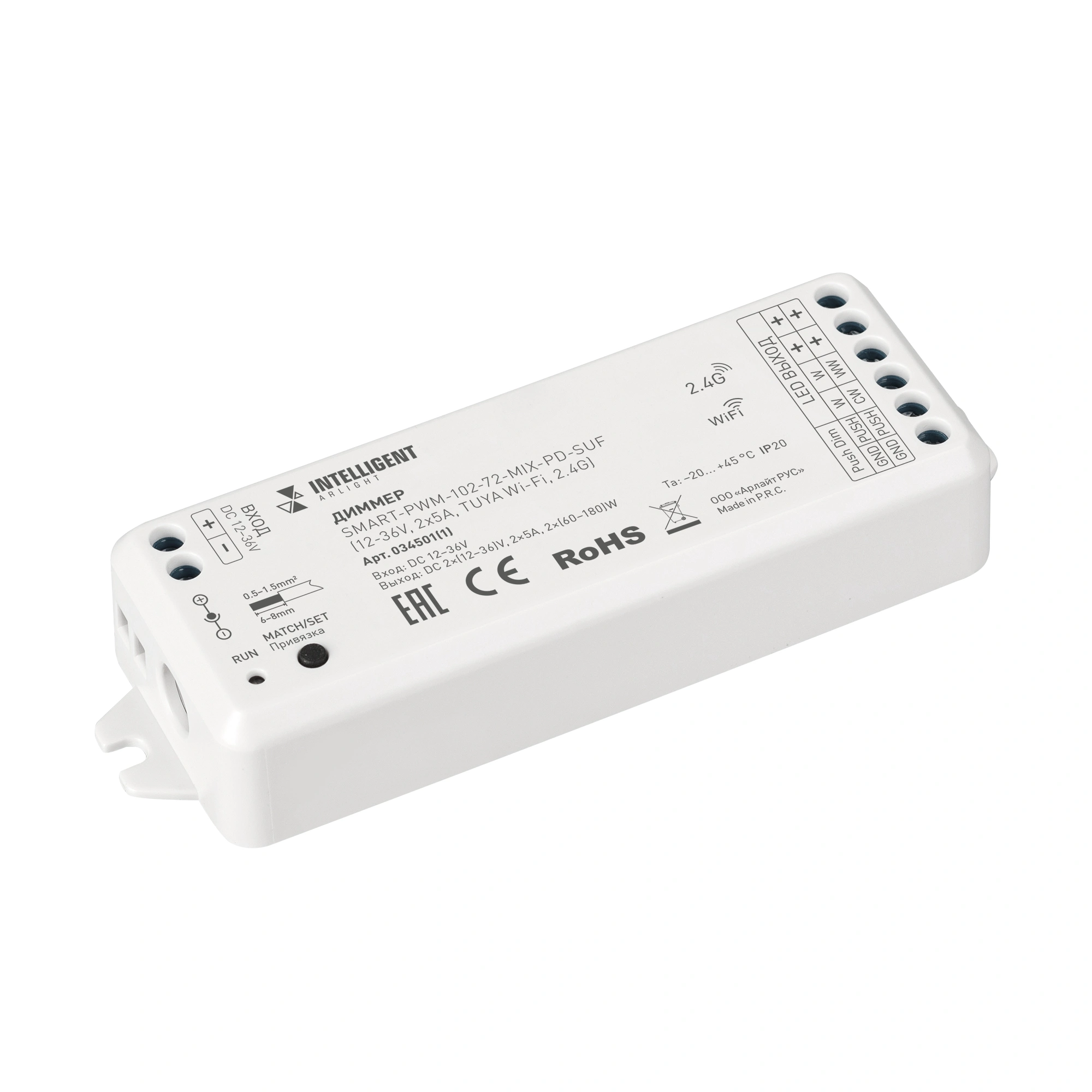 Характеристики - INTELLIGENT ARLIGHT Диммер SMART-PWM-102-72-MIX-PD-SUF (12-36V, 2x5A, TUYA Wi-Fi, 2.4G) (IARL, IP20 Пластик, 5 лет)