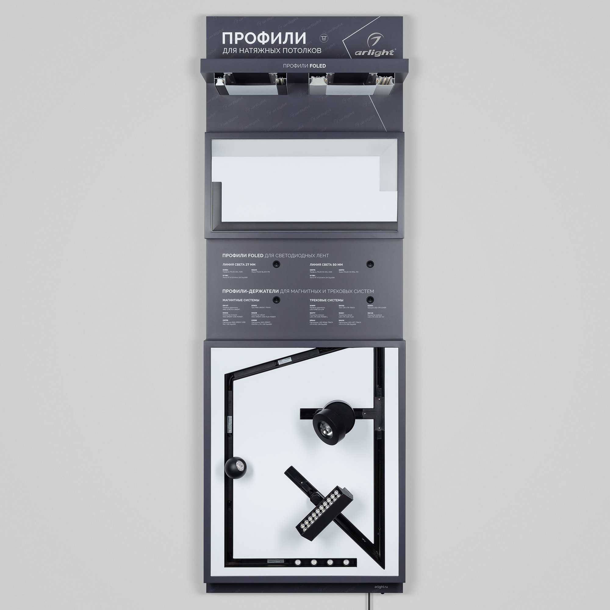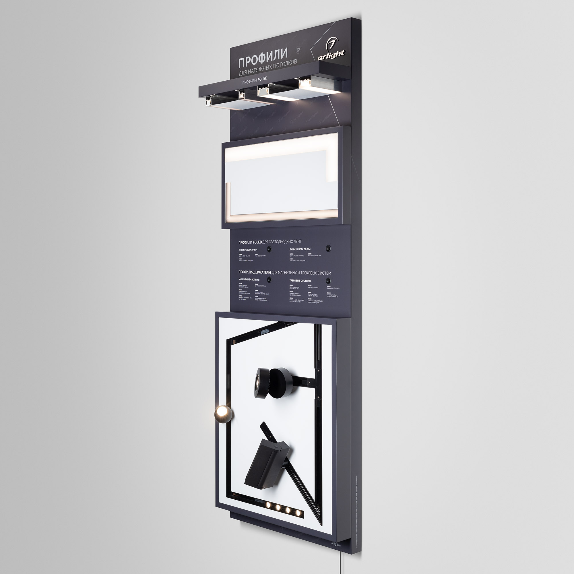На стенде представлен ассортимент профилей Arlight для натяжных потолков: Профиль серии FOLED, совмещающий в своей конструкции каркас для крепления натяжного потолка и профиль для установки светодиодной ленты. Профиль-держатель MAG STRETCH для установки магнитных треков в натяжной потолок.