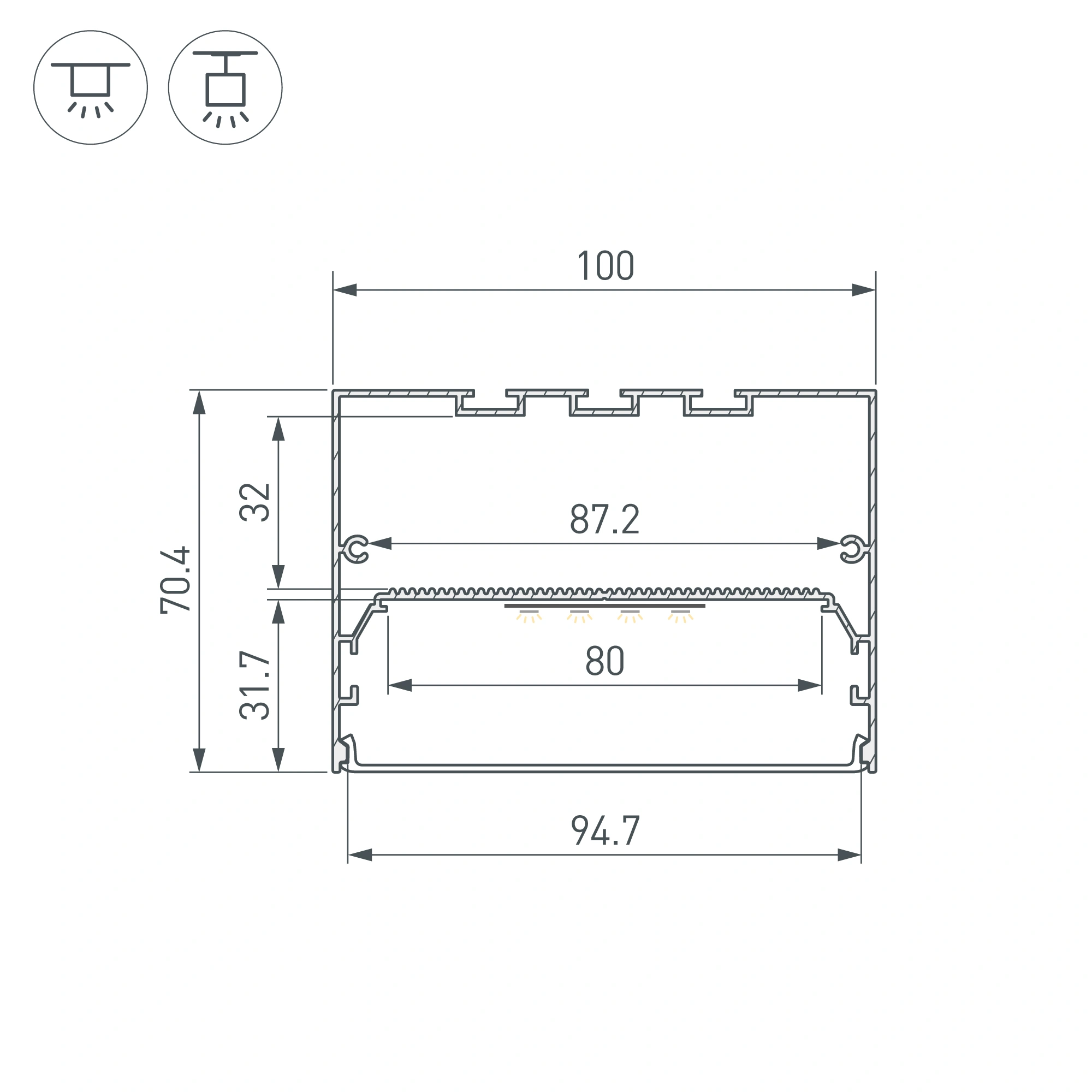 Накладной/подвесной профиль из анодированного алюминия для создания линейных светильников. Подходит для основного освещения. Габаритные размеры профиля составляют 2000 мм в длину, 100 мм в ширину и 70,4 мм в высоту. Площадка для лент позволяет использовать светодиодную ленту шириной до 80 мм и мощностью до 89 Вт/м. Размер отсека для блока питания: 87,2х32 мм. Это обеспечивает гибкость в выборе светодиодных лент и создает потрясающие световые решения. Экран, заглушки и другие аксессуары не включены в комплект и приобретаются отдельно. Цена указана за 1 метр профиля. Отличное решение для создания современных световых проектов.