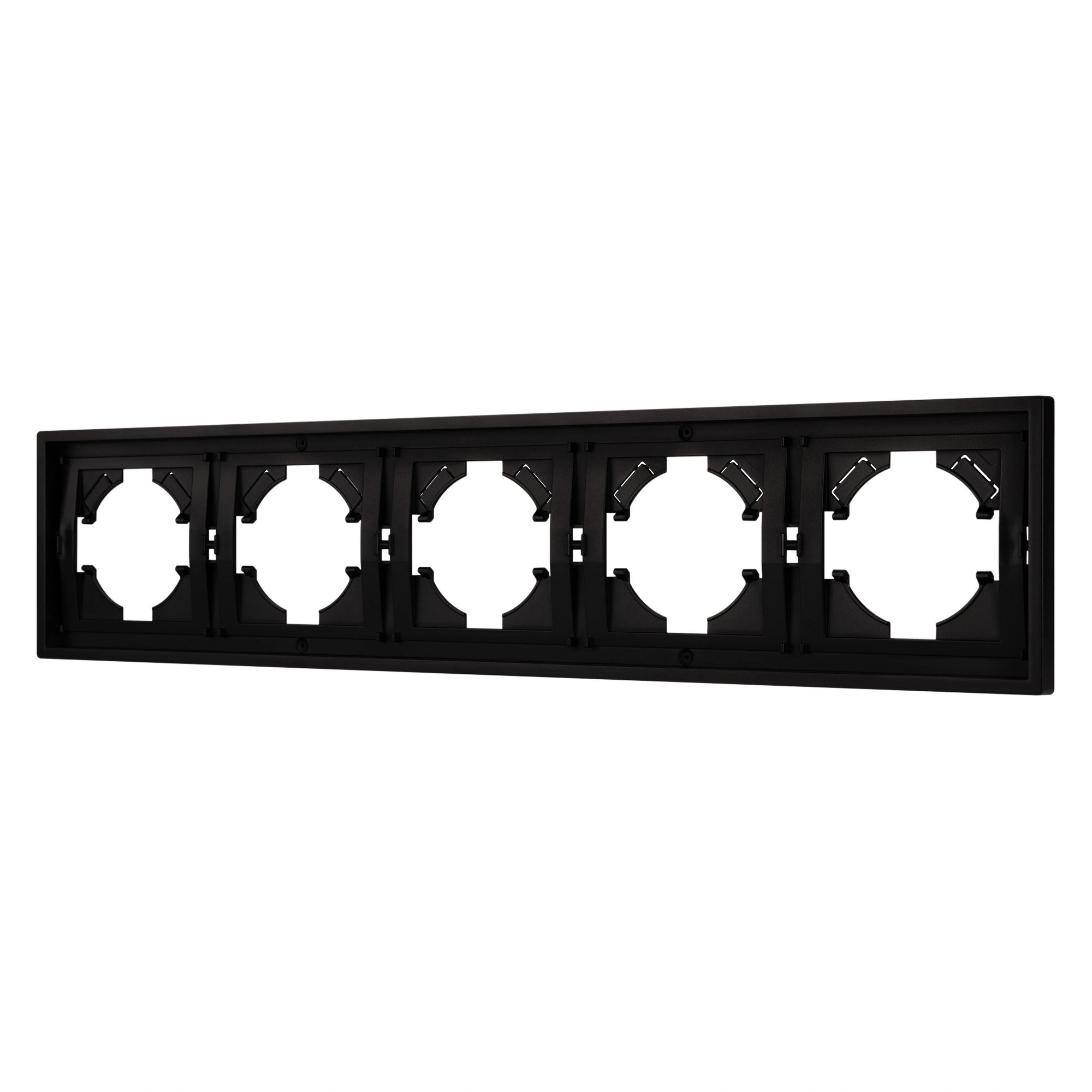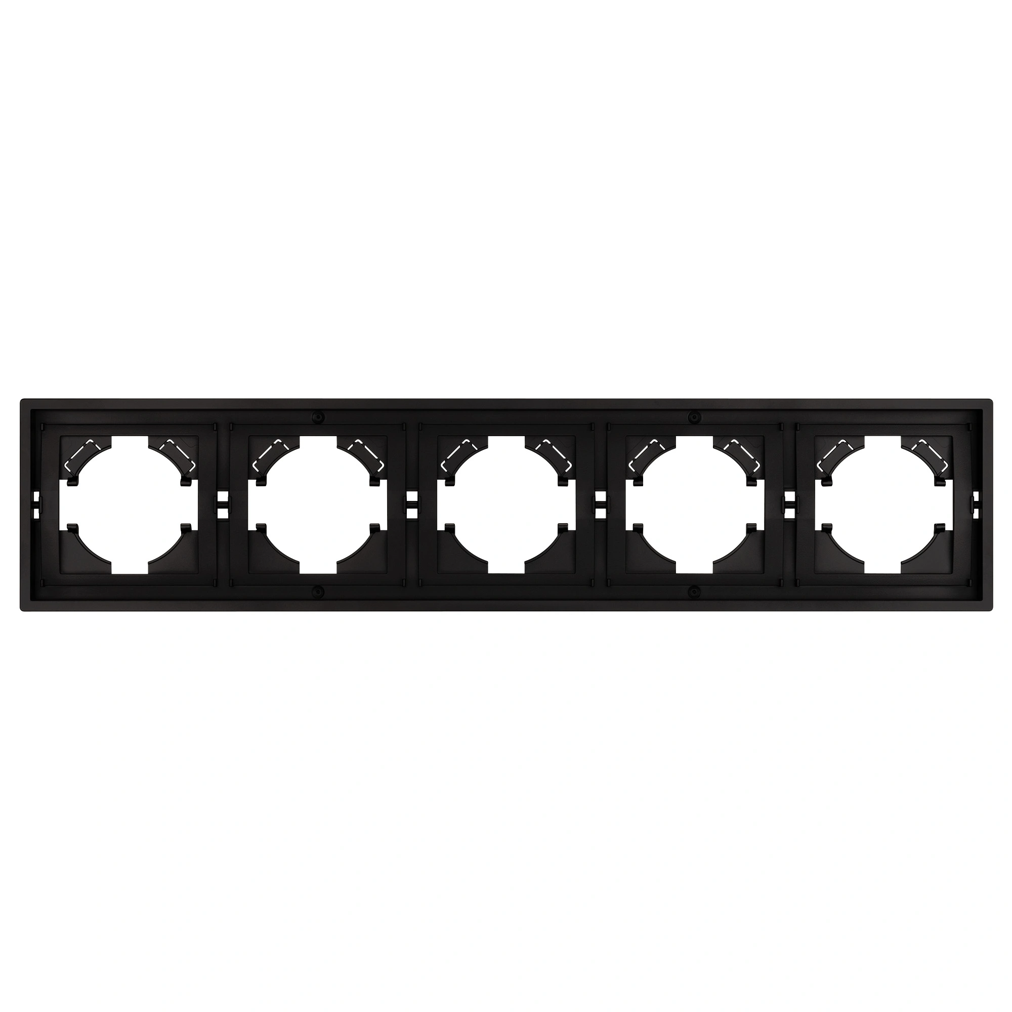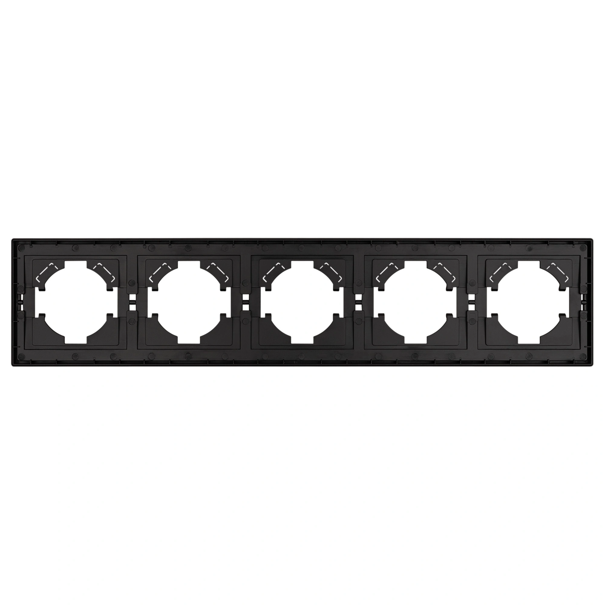 Рамка пластиковая на 5 постов, под встраиваемый механизм. Цвет - черный. Среднего уровня герметичности IP20. Ориентация монтажа горизонтальная.