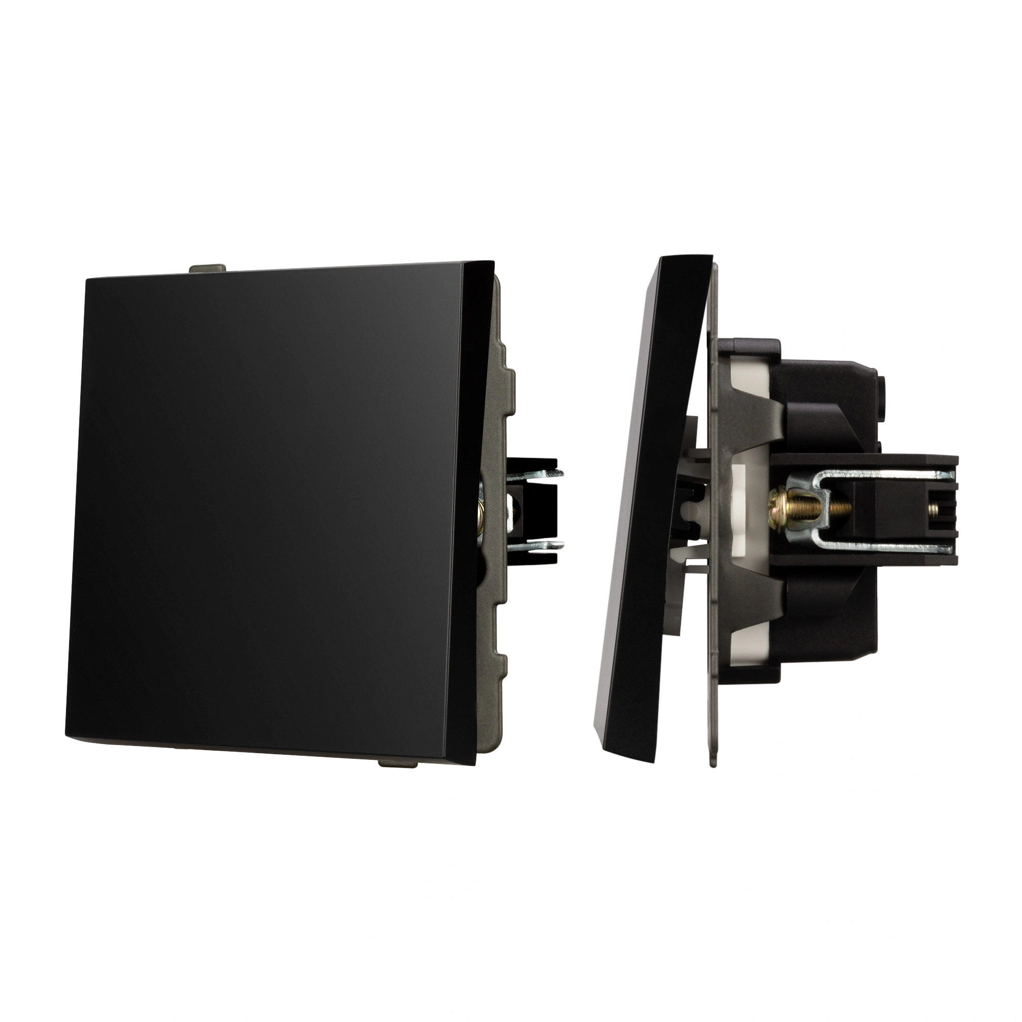 Механизм выключателя света клавишный на 1 пост 1 клавиша (непроходной). Цвет - черный. Без фронтальной рамки. Уровень пылевлагозащиты IP20. Выключатель устанавливается в стандартный подрозетник круглого сечения диаметром 60мм.