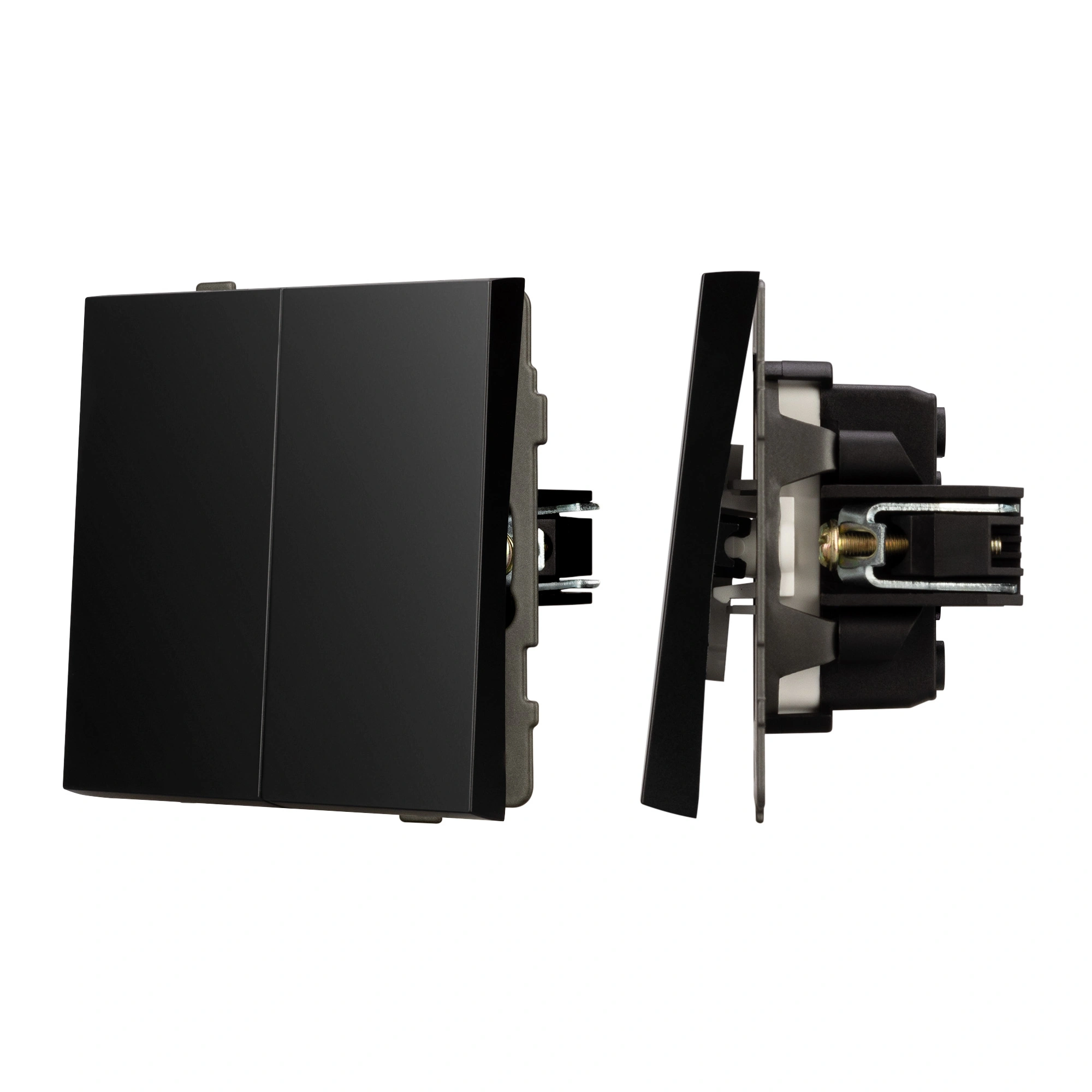 Механизм выключателя света клавишный на 1 пост 2 клавиши (проходной). Цвет - черный. Без фронтальной рамки. Уровень пылевлагозащиты IP20. Выключатель устанавливается в стандартный подрозетник круглого сечения диаметром 60мм.