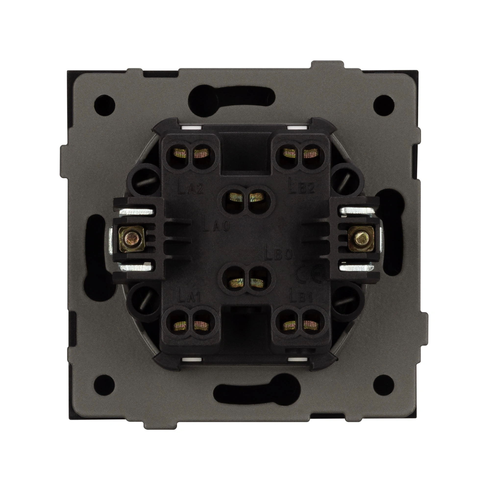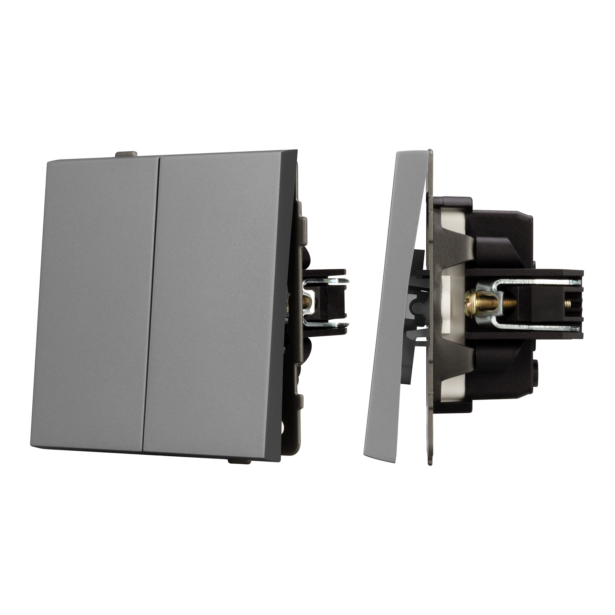 Механизм выключателя света клавишный на 1 пост 2 клавиши (проходной). Цвет - серый. Без фронтальной рамки. Уровень пылевлагозащиты IP20. Выключатель устанавливается в стандартный подрозетник круглого сечения диаметром 60мм.