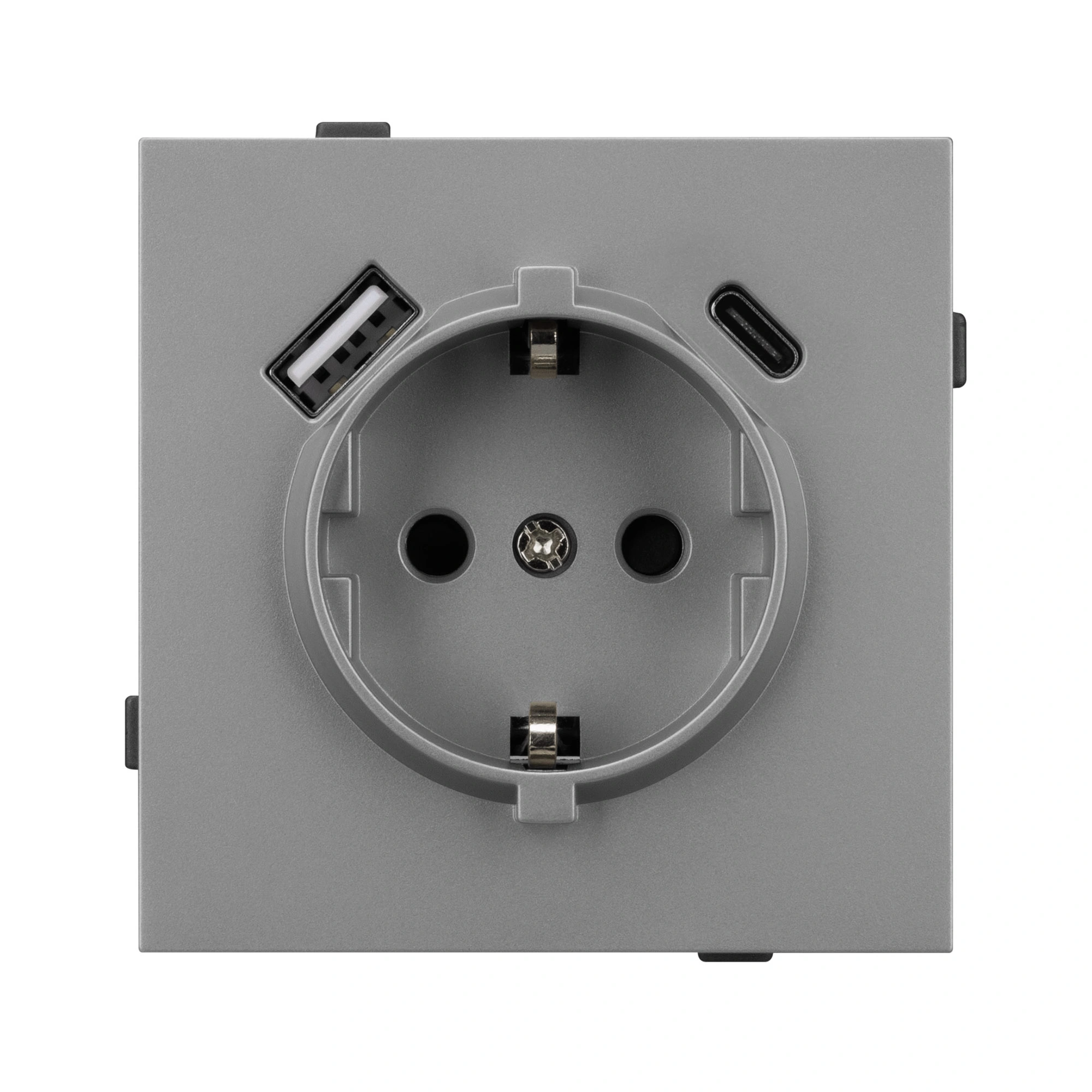 Механизм розетки с заземлением 1 пост 2 USB Type A+C порта. Цвет - серый. Без фронтальной рамки. Уровень пылевлагозащиты IP20. Розетка устанавливается в стандартный подрозетник круглого сечения диаметром 60мм.
