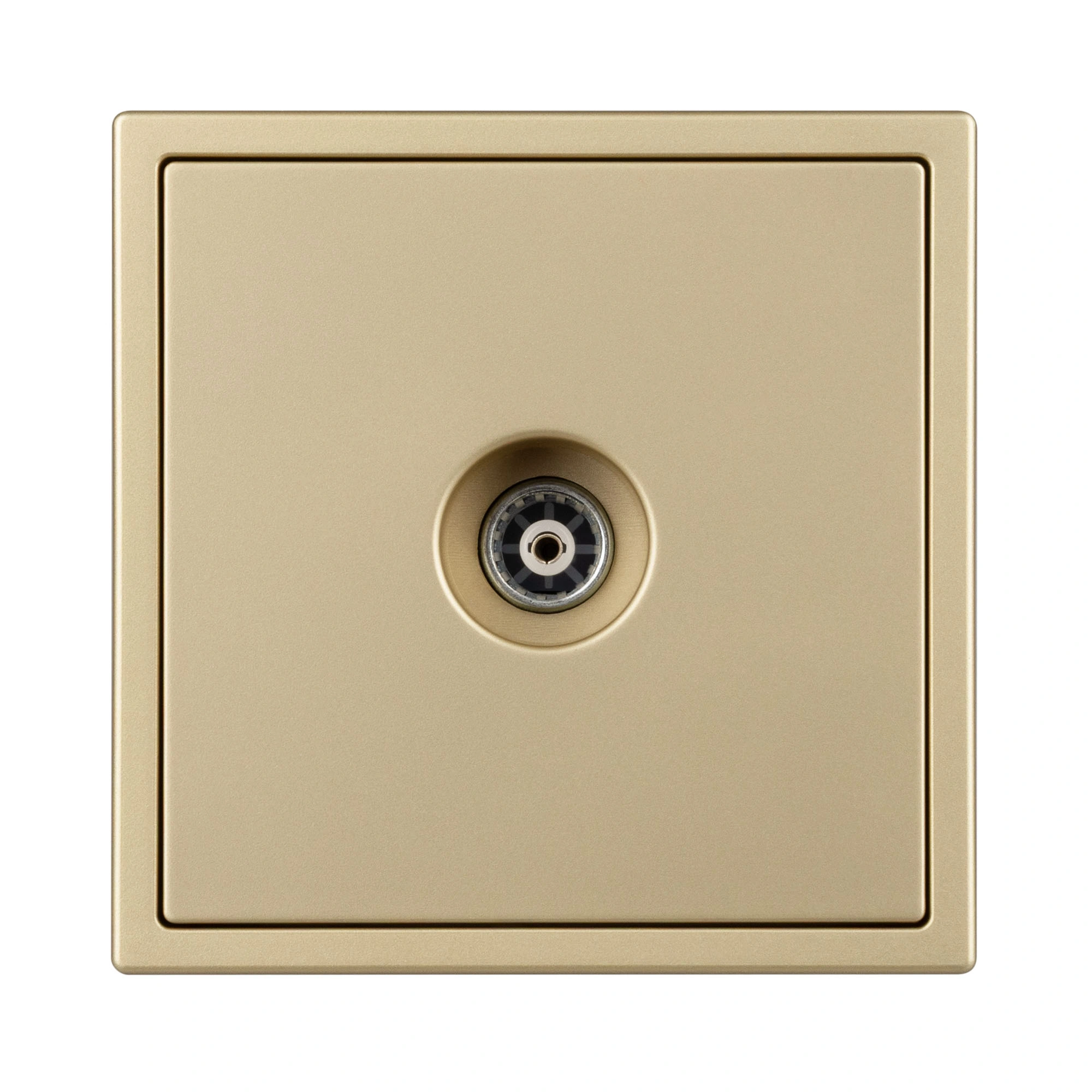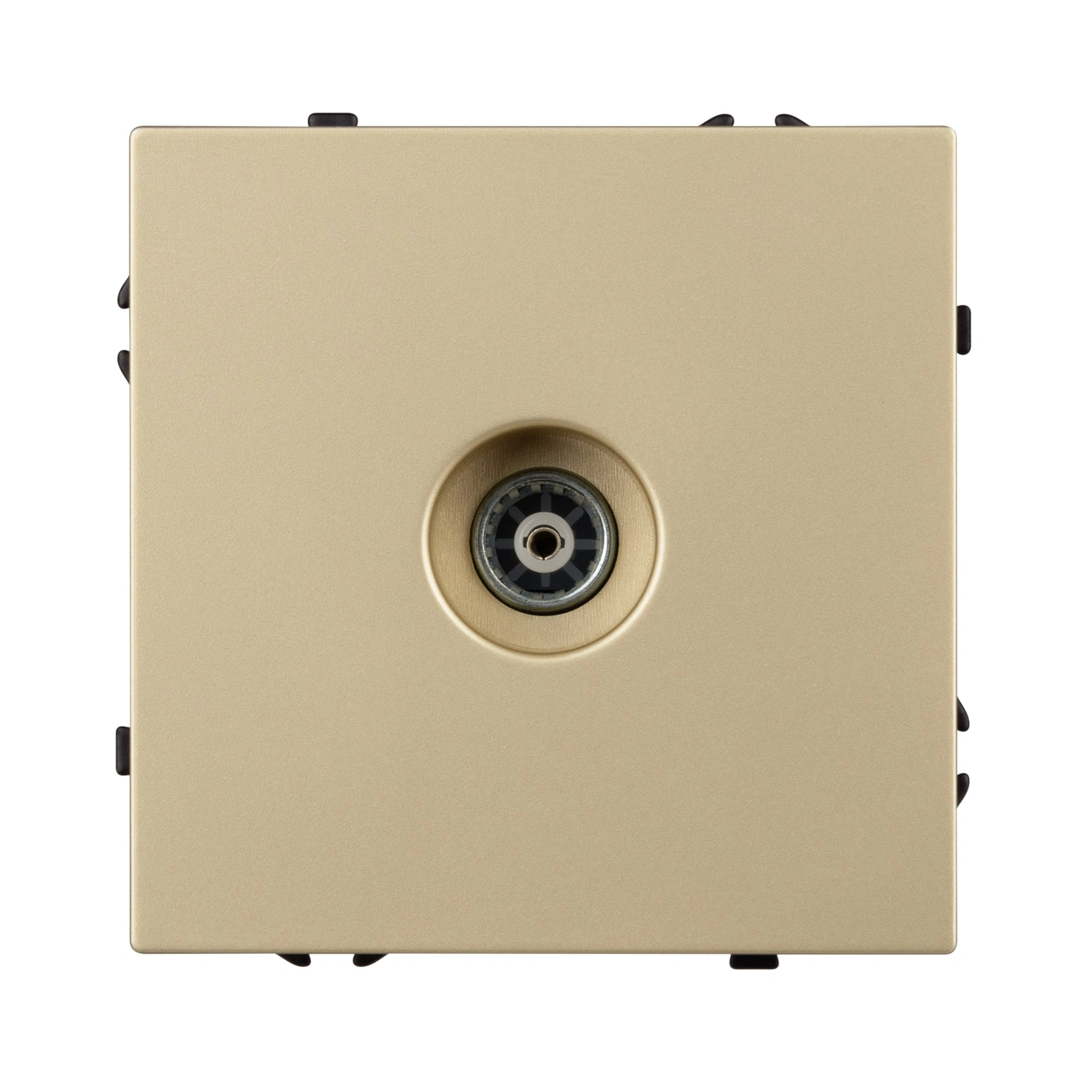 Строгие геометрические линии гармонично сочетаются с функциональностью продуманных механизмов, создавая идеальное решение для дизайн-проектов, где важны как эстетика, так и практичность. Механизм ТВ-розетки совместим с рамками серии NOBE, создает утонченный минималистичный вид. Скрытый тип монтажа позволяет гармонично встроить в интерьер любого современного дизайн-проекта. Видимая часть выполнена из высококачественного пластика цвета золотой песок и имеет Soft-Touch покрытие, что придает изделию приятные тактильные ощущения и стильный внешний вид. Механизм ТВ-розетки предназначена для подключения кабельного телевидения, путем подсоединения коаксиального кабеля к винтовому зажиму. Усиленные распорные лапки двойного захвата надежно фиксируют устройство в установочном подрозетнике круглого сечения диаметром 60мм. Суппорт окрашен в черный матовый цвет и выполнен из металла толщиной 1,5мм, что обеспечивает безопасность и уверенность в установке. На каждой стороне суппорта размещены фиксирующие элементы, позволяющие комбинировать механизмы в системы до 5шт как горизонтально, так и вертикально.